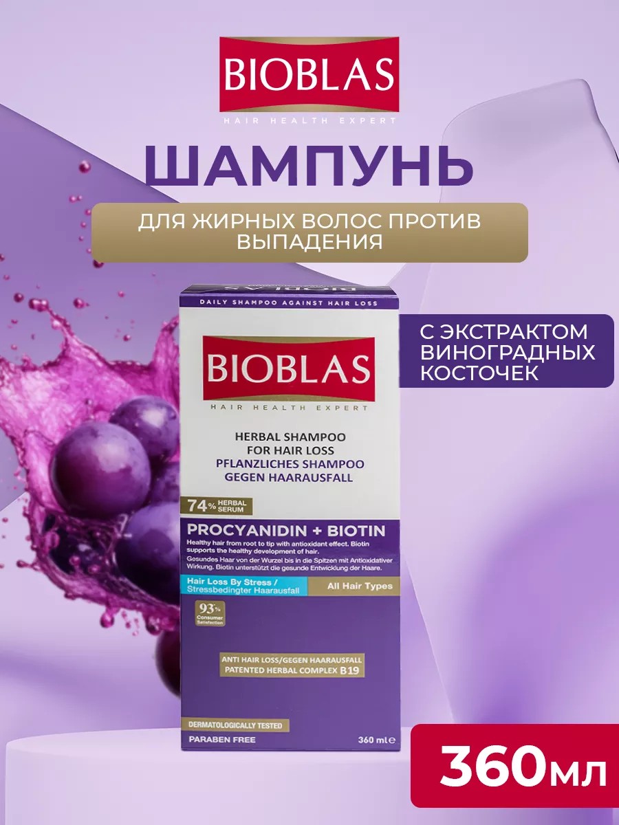 Шампунь для волос Bioblas против выпадения и для роста — профессиональный уход для жирной кожи головы с уникальной формулой B19 и активами процианид (виноградные косточки) и биотин. Регулирует жирность кожи головы, укрепляет корни и стимулирует рост густых и здоровых волос, возвращая свежесть и блеск.