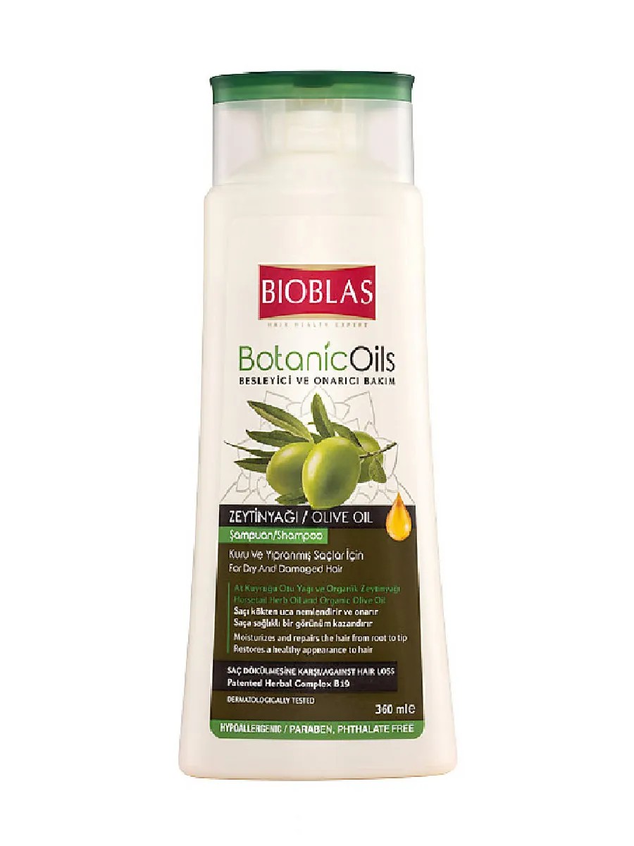 Bioblas, Шампунь для сухих поврежденных волос, с оливковым маслом, 360 мл. Содержит запатентованный растительный комплекс с витамином B19 против выпадения волос, органическое оливковое масло и масло хвоща полевого. Глубоко питает, увлажняет и восстанавливает волосы от корней до кончиков. Шампунь с оливковым маслом питает и укрепляет волосяные фолликулы, делая их шелковистыми и блестящими. Стимулирует рост, предотвращает выпадение и даже устраняет перхоть, сухость и ломкость. Делает волосы гладкими и здоровыми. Натуральные ингредиенты в шампуне активно восстанавливают сухие и поврежденные волосы. Вредные внешние факторы и психологические процессы в нашем организме со временем ослабляют и повреждают волосы. Масло оливы является мощным антиоксидантом, который восстанавливает пряди от корней до кончиков и устойчивость к вредным внешним факторам. Восстанавливает кожу головы и волосяные луковицы.