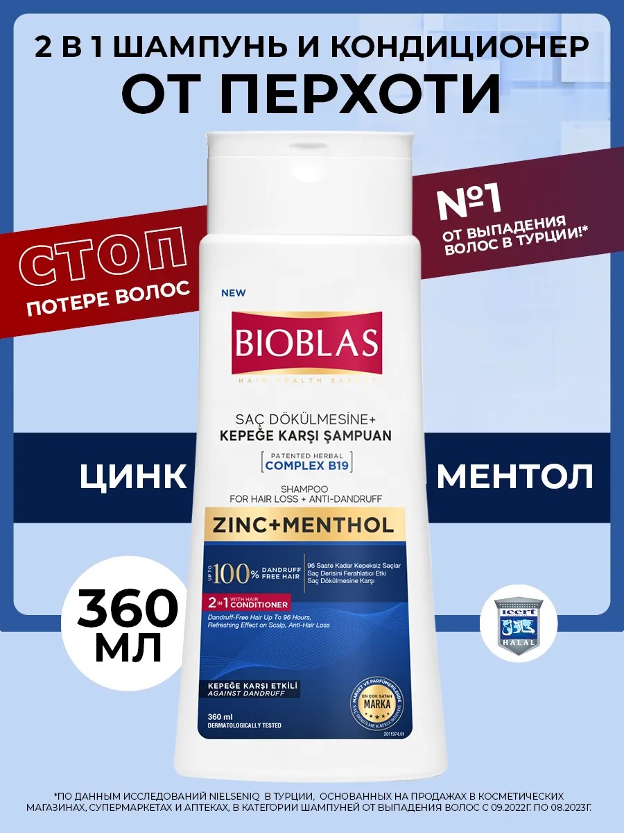 2в1 Шампунь-кондиционер от перхоти, против выпадения, с содержанием цинка и ментола разработан на последних достижениях современной косметологии и фармакологии для борьбы с перхотью и улучшения состояния кожи головы и волос. Цинк в составе средства помогают снизить интенсивность проявлений перхоти, раздражений кожи головы, зуда, шелушения и неприятных ощущений, способствуют восстановлению барьерных функций на фоне повышенного шелушения и снижения местного иммунитета кожи головы, уменьшают проявление перхоти, нормализуют процессы ороговения кожи головы, успокаивают раздражения, регулируют повышенную секрецию сальных желез. Zinc также способствует лучшему питанию волосяных луковиц. В результате снижается выпадение волос, пряди становятся более сильными и блестящими, лучше противостоят вредным воздействиям и быстрее растут. Цинк препятствует раннему появлению седины, улучшает клеточный обмен и способствует образованию аминокислот, которые оберегают волосы от выпадения. Ментол в составе шампуня обладает освежающим и охлаждающим эффектом и придает волосам здоровый блеск. Витамин B19 помогает предотвратить выпадение волос, укрепляет корни и стимулирует рост волос. Шампунь BIOBLAS разработан для решения таких проблем, как перхоть и чрезмерное выпадение волос. Благодаря своей уникальной формуле, основанной на натуральных компонентах, шампунь мягко очищает кожу головы, устраняя перхоть, не пересушивая кожу головы. Можно использовать как женский и мужской. Гипоаллергенный. Способ применения: нанесите необходимое количество шампуня на влажные волосы, равномерно распределите по всей длине, слегка массируя кожу головы до образования пены. Подождите 1–2 минуты и тщательно смойте теплой водой. При необходимости повторите процедуру. Вся продукция BIOBLAS имеет сертификаты качества и поставляется напрямую с завода в Турции. Продукты BIOBLAS – ваши надежные средства против перхоти, от выпадения и для роста красивых здоровых волос!