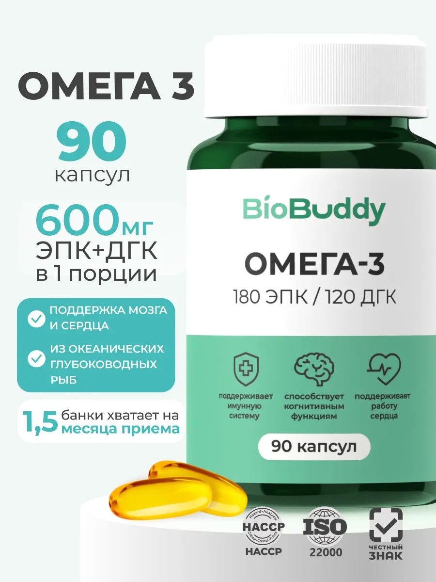 Омега 3 в капсулах 90 шт от BioBuddy – это важные и незаменимые для человека полиненасыщенные жирные кислоты: эйкозапентаеновая (ЭПК/EPA) и докозагексаеновая (ДГК/DHA), получаемые из рыбьего жира. Они необходимы человеческому организму, но сами в нём не вырабатываются, поэтому должны поступать с пищей или в виде специализированных добавок и витаминных комплексов, которые более эффективны, чем обычный рыбий жир.