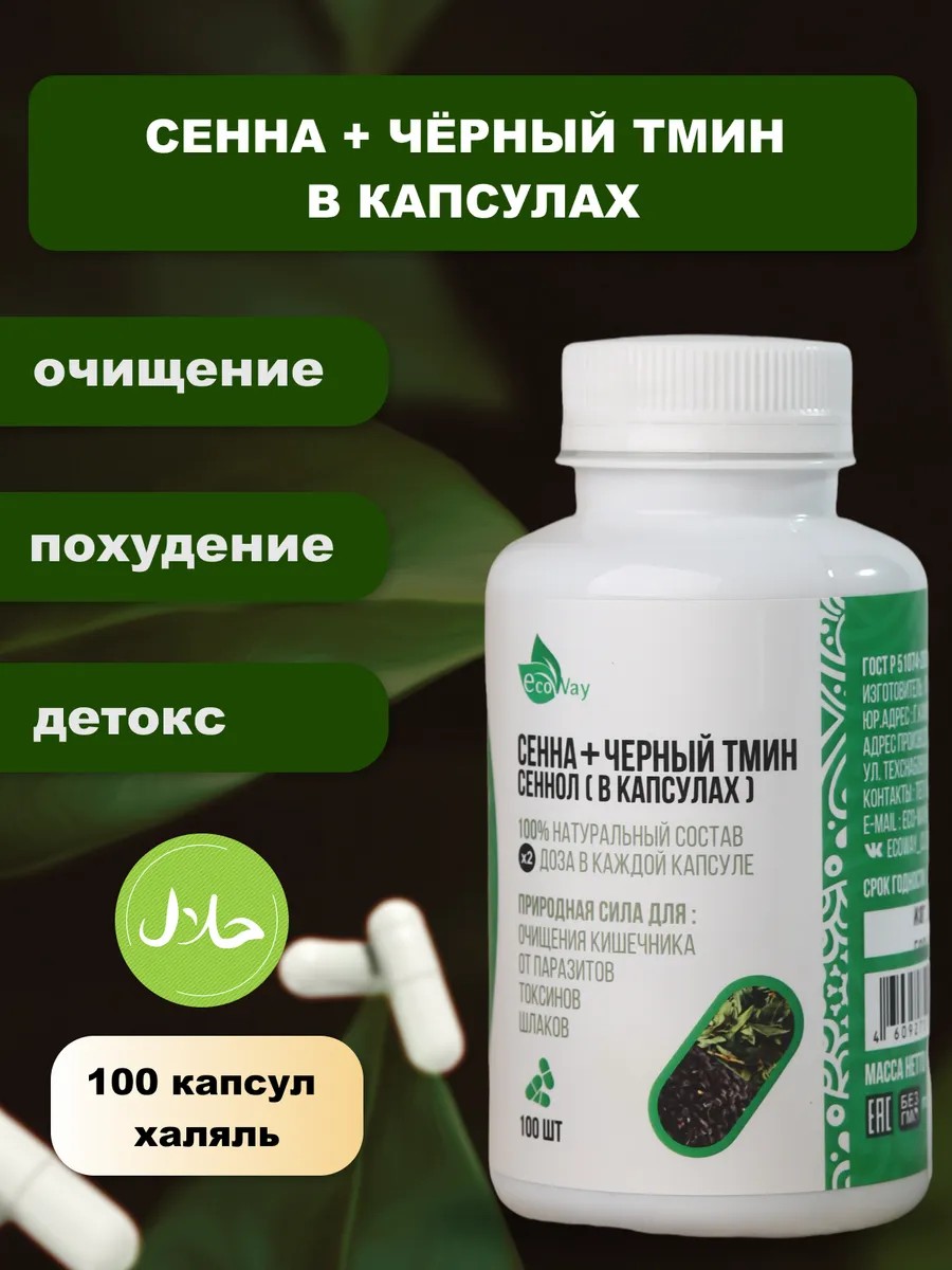 Сенна с черным тмином в капсулах БИОКЛИК by EcoWay. Сенна мекканская – это разновидность сенны, кассии узколистной. Сенна лист (кассия) используется для очищения организма и нормализации стула, повышает моторную функцию кишечника. Сеннол в капсулах - это фитопрепарат для снижения веса. Мягко воздействует на кишечник, очищает организм от шлаков и токсинов. Сушеная резаная сенна используется как антипаразитарный комплекс, оказывая антигельминтное действие. Рекомендуется принимать на ночь, как и все другие средства, обладающие слабительными свойствами. Листья сенны используются во многих сборах и чаях для похудения и для очищения организма. Сенна улучшает состояние кожи и волос. Также используется как укрепляющая хна для волос. Листья сенны известны как слабительное средство почти во всех странах. Действие сенны уникально тем, что она не просто очищает кишечник от калловых масс, она так же очищает ворсинки кишечника от застоев и бляшек. Как известно, ворсинки кишечника относятся к периферийной иммунной системе. Очищая эти ворсинки сенна восстанавливает иммунную систему организма. Поэтому очищение сенной рекомендуется при многих заболеваниях. . Сенол - отличное средство от запора, средство от глистов и паразитов, средство для чистки и восстановления печени. Свежие семена черного тмина (нигелла) индийского сорта отличаются достаточно высоким содержанием питательных элементов и жирных кислот. Черный тмин нормализует пищеварение, способствует очищению от токсинов и плохого холестерина. Его употребление повышает жизненный тонус, работоспособность, снимает аллергические реакции, укрепляет иммунитет.