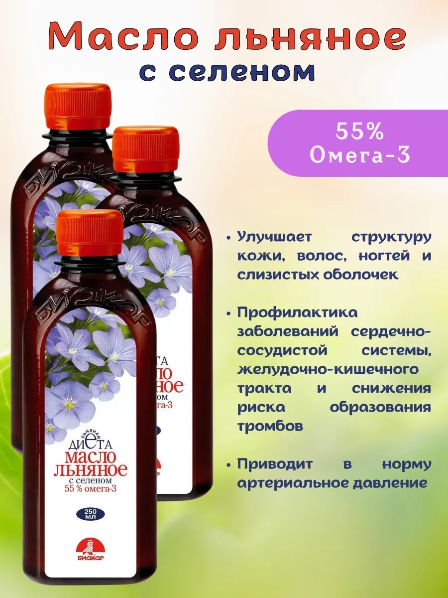 Льняное масло с селеном - это биологически активная добавка (БАД) к пище - натуральный высокоэффективный продукт, источник незаменимых полиненасыщенных жирных кислот (ПНЖК): Омега-3 (55 %) и Омега-6 (10-20%), для поддержания здоровья и сохранения красоты. В масло введен уникальный жирорастворимый антиоксидант - селенопиран, содержащий органический селен - важнейший элемент, обеспечивающий антиоксидантную защиту клеток организма, а также предохраняющий масло от прогоркания и окисления. Масло льна с селеном помогает улучшить состояние кожи и волос, поддерживает здоровый уровень холестерина и снижает риск развития сердечно-сосудистых заболеваний. Масло льняное с селеном «Биокор» вырабатывается технологией первого холодного отжима и не рафинируется, что позволяет сохранить все его полезные свойства. Специфический запах (рыбьего жира) и горьковатый вкус - отличительная особенность натурального льняного масла. Регулярное употребление льняного масла благоприятно сказывается на организме человека. Продукт способен улучшить работу кровеносных сосудов и сердца, снизить риск образования тромбов и нормализовать давление. Средство поддерживает иммунитет, снижает уровень холестерина, способствует мозговой деятельности. Льняное масло служит источником Омега-3 и Омега-6, которые не синтезируются организмом и поступают лишь с пищей. При этом Омега-3 достаточно много лишь в льняном масле, в то время как Омега-6 также присутствует и в других. В льняном масле Омега-3 больше, чем в рыбьем жире, в два раза. Омега 3 и 6 необходимы организму для улучшения активности клеток и нормализации процессов обмена. Эти вещества внедряются в структуру клеток и повышают скорость передачи импульсов.