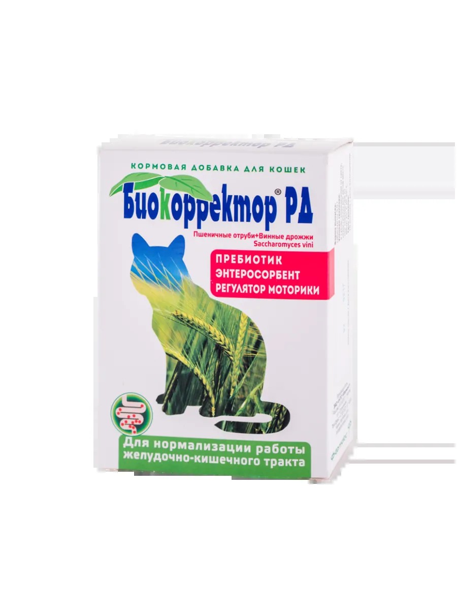 Биокорректор - натуральная биологически активная кормовая добавка для кошек и собак для эффективного решения проблем желудочно-кишечного тракта. Обеспечивает комплексный подход к решению проблем ЖКТ за счет оптимального сочетания сорбционных, пребиотических, моторикостимулирующих свойств. Улучшает пищеварение, нормализует работу кишечника, очищает организм от вредных веществ, улучшает состояние кожи и шерсти. Изготавливается по уникальной технологии из пшеничных отрубей, ферментированных штаммом винных дрожжей Saccharomyces vini.