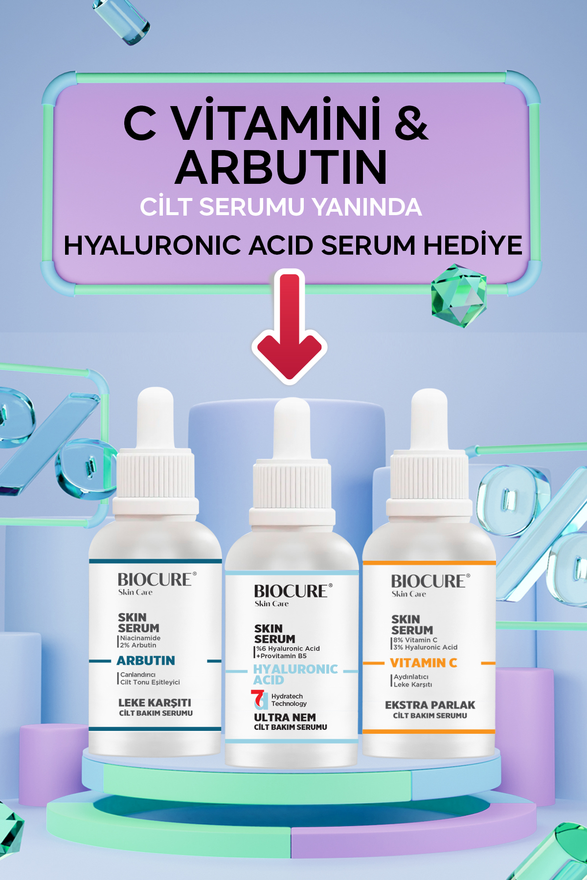 • C Vitamini Cilt Serumu ve Arbutin Cilt Serumu yaninda Hyaluronic Acid Cilt Bakim Serumu Bedava