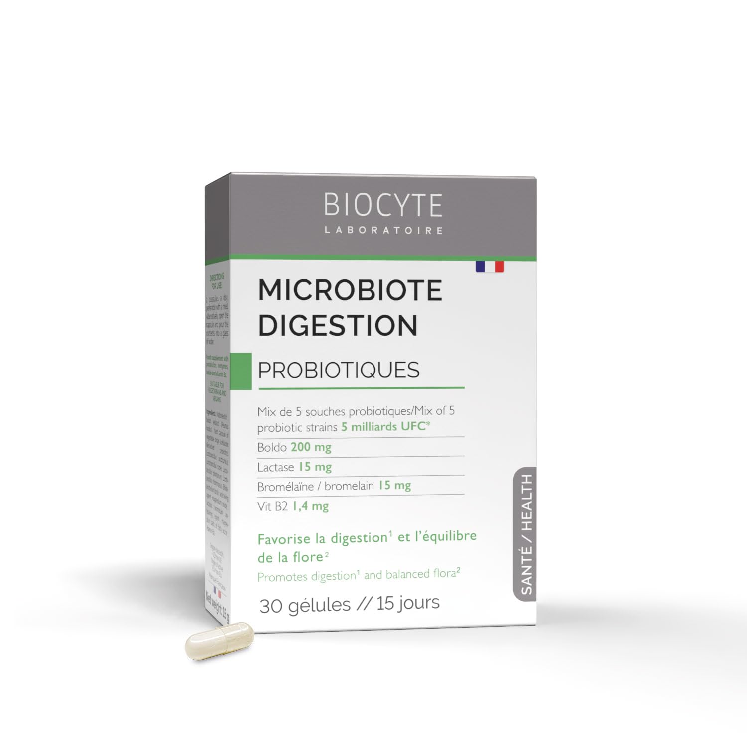 ABOUT BIOCYTE LABORATORY: Our products, the result of many years of research, are designed with criteria of quality and clinically proven efficacy. We have been awarded the Victoire de la Beauté prize more than 10 times, a jury composed entirely of consumers who test the products blind. Biocyte, 42 rue Washington, 75008 PARIS, France. Customer service: 080-080-8909. DIRECTIONS FOR USE: The recommended use of our Microbiota Digestion food supplement is 2 capsules per day. It is also possible to open the capsule and pour its contents into a glass of water. A FORMULA ENRICHED WITH DIGESTIVE ENZYMES: Digestive enzymes (lactase, bromelain) facilitate the assimilation of nutrients and the digestion of lactose. An Ifop study (2021) reveals that 45 of people suffer from digestive disorders and 70 of those with lactose intolerance are lactase deficient. Combined with boldo extract and vitamin B2 in our Microbiota Digestion food supplement, these contribute to intestinal comfort. 5 PROBIOTIC STRAINS: The gut flora, also known as the microbiota, plays a key role in digestion and intestinal balance. The formula of our food supplement combines 5 probiotic strains to strengthen this essential ecosystem. Each daily intake of 2 capsules provides 5 billion CFU, ensuring targeted action to support a healthy and balanced gut flora. DIGESTION FOOD SUPPLEMENT: Microbiota Digestion is a food supplement featuring a unique formula designed to promote digestion and proper intestinal function. It combines a mix of 5 probiotic strains for the balance of the intestinal flora, digestive enzymes (lactase, bromelain) to improve the assimilation of nutrients, as well as an extract of boldo known for its digestive benefits.À PROPOS DU LABORATOIRE BIOCYTE : Nos produits, fruits de longues années de recherche, sont conçus avec des critères de qualité et d'efficacité cliniquement prouvée. Nous avons été récompensés plus de 10 fois au Prix de la Victoire de la Beauté, jury composé à 100 de consommateurs testant les produits à l'aveugle. Biocyte, 42 rue Washington, 75008 PARIS FR. Service clientèle : 080-080-8909. CONSEILS D'UTILISATION : La préconisation d'utilisation de notre complément alimentaire Microbiote Digestion est de 2 gélules par jour. Il est également possible d'ouvrir la gélule et de verser son contenu dans un verre d'eau. UNE FORMULE ENRICHIE EN ENZYMES DIGESTIVES : Les enzymes digestives (lactase, bromélaïne) facilitent l'assimilation des nutriments et la digestion du lactose. Une étude Ifop (2021) révèle que 45 des personnes souffrent de troubles digestifs et 70 des intolérants au lactose manquent de lactase. Associées à l'extrait de boldo et à la vitamine B2 dans notre complement alimentaire Microbiote Digestion, elles contribuent au confort intestinal. 5 SOUCHES DE PROBIOTIQUES : La flore intestinale, aussi appelée microbiote, joue un rôle clé dans la digestion et l'équilibre intestinal. La formule de notre complément alimentaire associe 5 souches de probiotiques pour renforcer cet écosystème essentiel. Chaque prise quotidienne de 2 gélules apporte 5 milliards d'UFC, assurant une action ciblée pour soutenir une flore intestinale saine et équilibrée. COMPLÉMENT ALIMENTAIRE DIGESTION : Microbiote Digestion est un complément alimentaire mettant en avant une formule unique conçue pour favoriser la digestion et le bon fonctionnement intestinal. Il associe un mix issu de 5 souches probiotiques pour l'équilibre de la flore intestinale, des enzymes digestives (lactase, bromélaïne) pour améliorer l'assimilation des nutriments, ainsi qu'un extrait de boldo reconnu pour ses bienfaits digestifs.BIOCYTE Microbiote Digestion - Probiotiques Flore Intestinale - 5 Souches Probiotiques, Boldo, Vitamine B2, Lactase Bromelaine - Programme 15 Jours