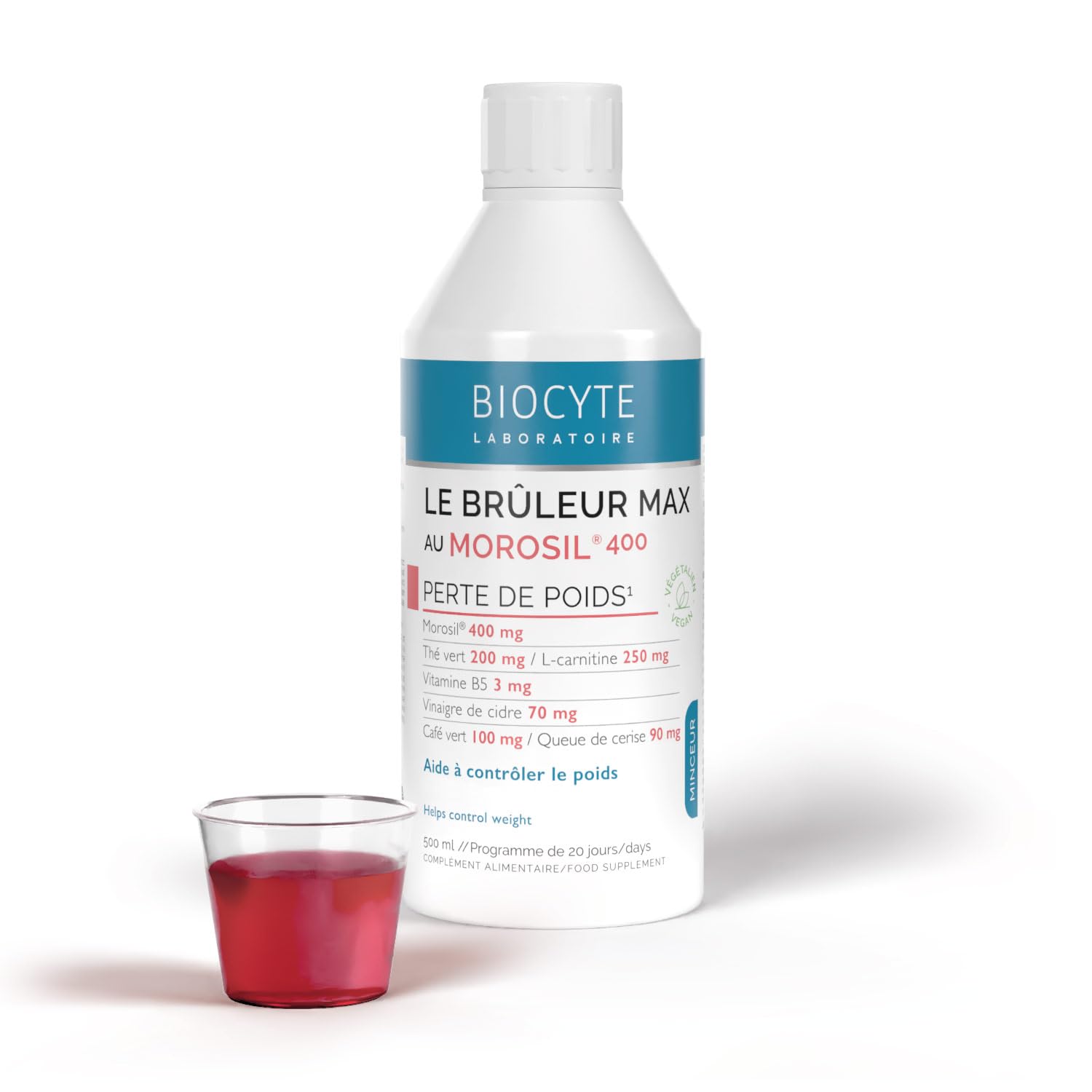 ABOUT BIOCYTE LABORATORY: A pioneer in food supplements and dermo-cosmetic skincare, Biocyte develops innovative products, which have received numerous awards for their effectiveness. BIOCYTE 42 rue Washington, 75008 PARIS. Customer service: 080-080-8909. DIRECTIONS FOR USE: Dilute 25 ml in a large glass of water for a pleasant experience. Include this supplement, rich in MOROSIL and apple cider vinegar, in your daily routine for visible results, in addition to a healthy diet and regular physical activity. TARGETED DUAL ACTION: A synergy of carefully selected active ingredients, such as Morosil and apple cider vinegar, known for their benefits in nutritional balance, particularly in helping to reduce sugar cravings. Its liquid format ensures rapid absorption for optimal effectiveness. RECOGNIZED ACTIVE INGREDIENTS: This food supplement contains Morosil, a patented extract of Moro red oranges with proven efficacy, as well as apple cider vinegar, green coffee, cherry stems, and a unique ProLT-B5 complex (L-Carnitine, green tea, and vitamin B5). This combination offers comprehensive support for well-being and bodily balance. NEW MOROSIL FORMAT: Discover the first Morosil in a bottle with a delicious cherry flavor. Specially designed to help you achieve your goals.À PROPOS DU LABORATOIRE BIOCYTE : Pionnier dans les compléments alimentaires et soins dermocosmétiques, Biocyte développe des produits innovants, récompensés à plusieurs reprises pour leur efficacité. BIOCYTE 42 rue washington, 75008 PARIS. Service clientèle : 080-080-8909. CONSEILS D'UTILISATION : Diluer 25 ml dans un grand verre d'eau pour une cure agréable. Incluez ce complément riche en MOROSIL et vinaigre de cidre dans votre routine quotidienne pour des résultats visibles, en complément d'une alimentation saine et d'une activité physique régulière. DOUBLE ACTION CIBLÉE : Une synergie d'actifs soigneusement sélectionnés, comme le Morosil et le vinaigre de cidre, reconnus pour leurs bienfaits dans l'équilibre nutritionnel, notamment en aidant à réduire les envies sucrées. Son format liquide garantit une absorption rapide pour une efficacité optimale. ACTIFS RECONNUS : Ce complement alimentaire contient du Morosil, un extrait breveté d'oranges rouges Moro à l'efficacité prouvée, ainsi que du vinaigre de cidre, café vert, queue de cerise et un complexe unique ProLT-B5 (L-Carnitine, thé vert et vitamine B5). Cette combinaison offre un soutien global au bien-être et à l'équilibre corporel. NOUVEAU FORMAT DU MOROSIL : Découvrez le 1er Morosil en format bouteille au délicieux goût de cerise. Spécialement conçu pour vous accompagner dans l'atteinte de vos objectifs.BIOCYTE Morosil Format Liquide Goût Cerise - Morosil 400mg, Vinaigre De Cidre, Vitamine B5 Thé Vert - Programme 20 Jours
