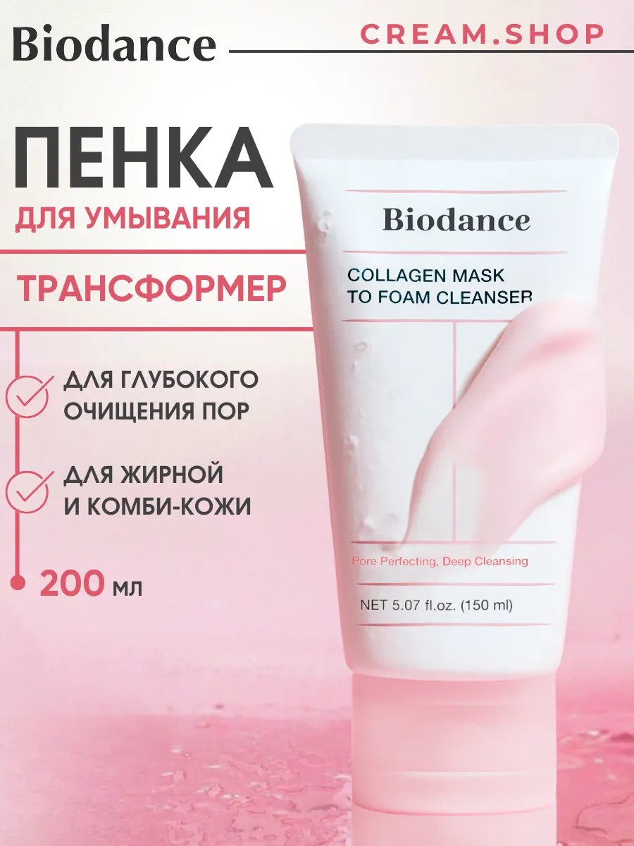 Пенка для умывания Biodance Collagen Mask to Foam Cleanser 2 в 1 – это уникальное корейское средство, которое эффективно очищает кожу лица и одновременно ухаживает за ней. Продукт деликатно удаляет загрязнения, излишки себума, а также макияж, сужает поры, борется с черными точками и жирным блеском, предотвращая появление новых комедонов. Продукт можно использовать как маску - оставить на 3-5 минут для глубокого очищения пор, а также ежедневно как средство для умывания: просто нанесите его на кожу, вспеньте и смойте водой.