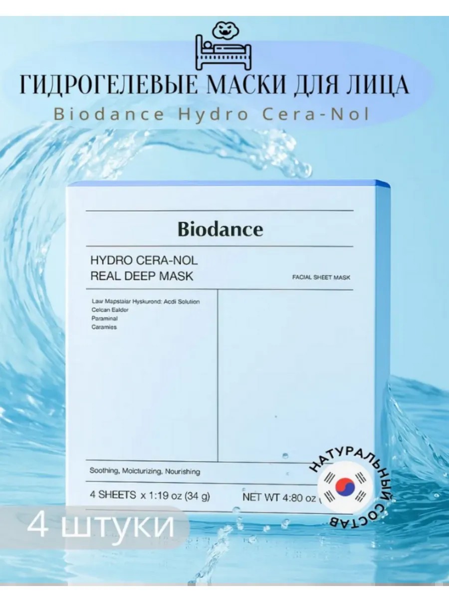 Набор гидрогелевых масок Biodance Hydro Cera-Nol Real Deep Mask инновационный корейский продукт для комплексного ухода за лицом. Этот набор включает ночные тающие маски, пропитанные концентрированной эссенцией, которые интенсивно питают, увлажняют и восстанавливают кожу, снижая чувствительность и укрепляя защитный гидролипидный барьер.