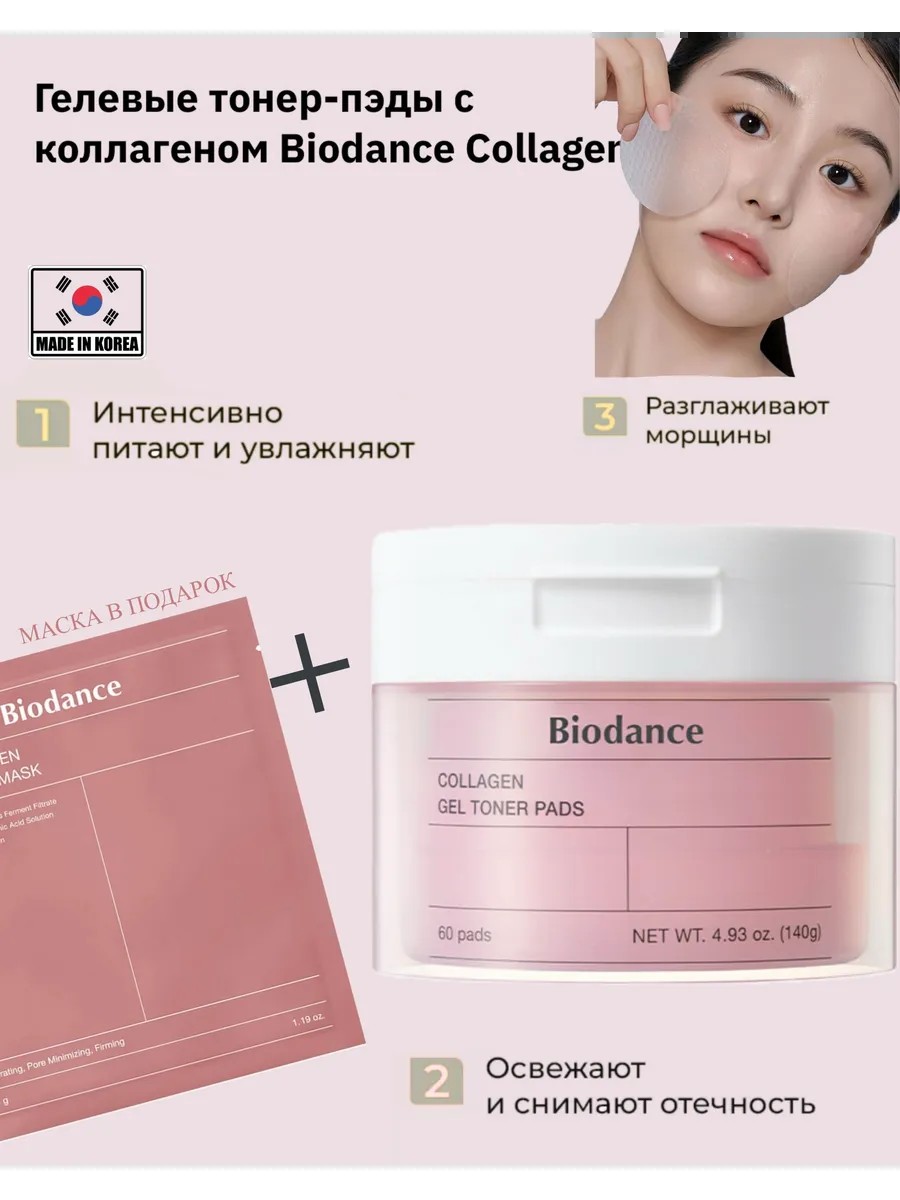 Гелевые тонер-пэды с коллагеном Biodance Collagen Gel Toner Pads повышают эластичность и тургор кожи, способствуют сужению расширенных пор.