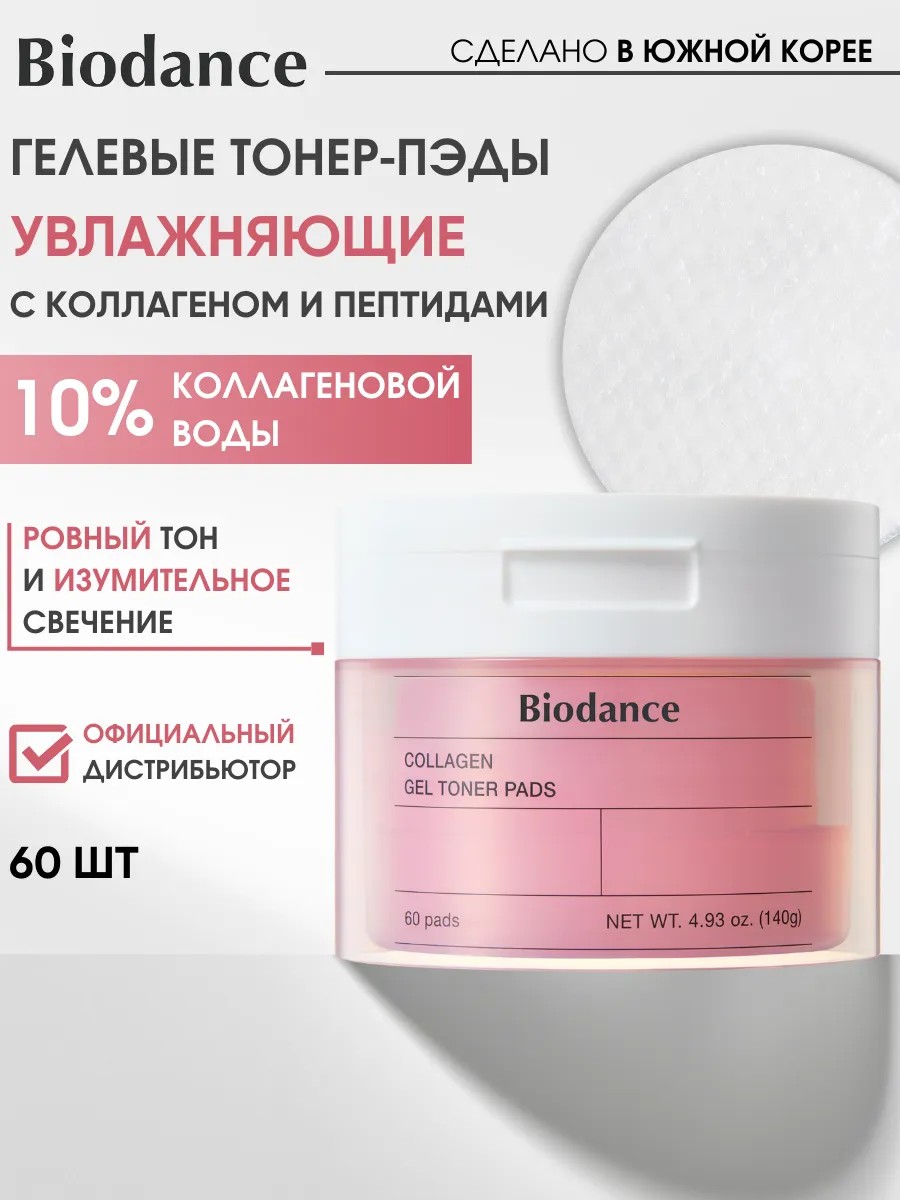 Подарите своей коже молодость и сияние с гелевыми тонер пэдами для лица Biodance Collagen Gel Toner Pads. Эти увлажняющие пэды из Кореи гораздо интенсивнее воздействуют на кожу, чем обычные хлопковые диски. Они интенсивно увлажняют кожу, повышают её упругость и эластичность, тонизируют, стягивают расширенные поры. Содержат мощные омолаживающие ингредиенты, такие как коллагеновая вода 10% и комплекс из 5 пептидов. Эти компоненты способствуют восстановлению кожи, уменьшая видимость морщин и придавая ей эластичность, сужают поры. Формула с гидролизованной гиалуроновой кислотой насыщает кожу влагой, обеспечивает защиту чувствительной кожи, создавая барьер от раздражений. Подходят для всех типов кожи, в частности, сухой и комбинированной. Средство можно использовать вместо тонера для лица ежедневно. Эти пэды идеально подходят для ухода за кожей женщин 50 и 60 +, станут великолепным подарком на день рождения или другой праздник. Позвольте себе насладиться всеми преимуществами корейской косметики и откройте для себя секрет ровного тона и непревзойденного сияния вашей кожи!