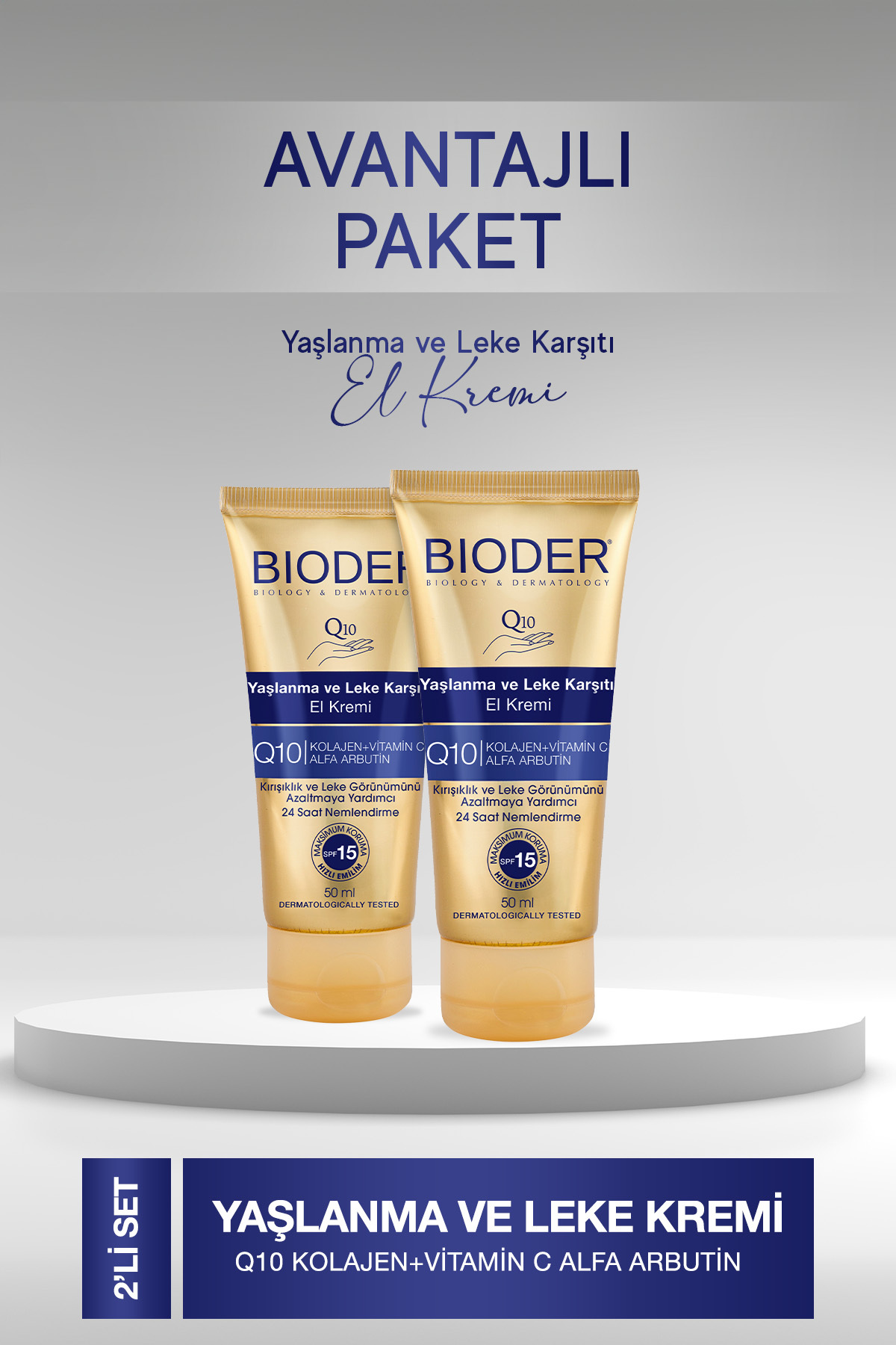 Bioder Yaslanma ve Leke Karsiti El Kremi, içerigindeki Alfa Arbutin, Koenzim Q10, Kolajen sayesinde ellerinizi sikilastirir ve lekeleri gidermeye yardimci olur. C Vitamini, canli ve parlak bir görünüm saglar. SPF 15 ile foto yaslanmaya karsi korur. Elleri nemlendirir ve kurulugu giderir. Hafif ve hos bir kokusu vardir. Elde yagli bir his birakmaz. Hizli emilir. Alkol içermez.