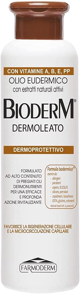Bioderm Dermoleato - 250ml is a moisturizing body oil with a high content of valuable skin -friendly oils and plant extracts with high, nourishing, moisturizing, calming and moprotective effect.Recommended for all types of massage and to treat all skin types such as babies, children, adults and older people.Also indicated for the treatment of scars and the prevention of stretch marks during pregnancy and after birth.Applied to suffocated, impoverished, dry or scaly skin, it restores the hydrolipide balance of the skin and ensures vitality and healthy well-being.Instructions for use: Apply with a slight massage to the skin until it is fully collected.Storage method: in a tightly closed bottle, in front of direct sunlight, in a cool, dry climate, store in a clean and well -ventilated place.The unopened product has a shelf life of more than 30 months, the open package should be used up within 12 months of opening.Prevention is better than healing!Experience the advantages of a dermatologically tested product on your skin, which has been used in hospitals and specialized senior facilities for over 20 years.✓ 100 Made in Italy Guarantee: All of our products are developed with the optimal quality you need and dermatologically tested by experts to ensure the maximum care of your skin.✓ recommended for every massage: preventive treatments, physiotherapy massages, relaxation massages and baby massages.✓ With vitamins A, B, E, PP: They promote cell regeneration and microcirculation, give the skin vitality and promote their natural well -being.✓ IDEAL for treatment of sensitive skin: Dermoleato Biioderm Oil, which is applied to sensitive, suffocated, impoverished and dehydrated skin or on scars and stretch marks, restores the correct hydrolipide balance of the skin.✓ Formula with a high content of precious dermatable oils: Eudermal oils and plant extracts offer a high soft, nourishing, moisturizing, soothing and skin -protecting effect.BIODERM DERMOLEATO - 250ml ist ein feuchtigkeitsspendendes Körperöl mit einem hohen Gehalt an wertvollen hautfreundlichen Ölen und Pflanzenextrakten mit hoher rückfettender, nährender, feuchtigkeitsspendender, beruhigender und dermoprotektiver Wirkung. Empfohlen für alle Massagearten und zur Behandlung aller Hauttypen, wie Babys, Kinder, Erwachsene und ältere Menschen. Auch angezeigt zur Behandlung von Narben und zur Vorbeugung von Dehnungsstreifen während der Schwangerschaft und nach der Geburt. Auf erstickte, verarmte, trockene oder schuppige Haut aufgetragen, stellt es das Hydrolipid-Gleichgewicht der Haut wieder her und sorgt für Vitalität und gesundes Wohlbefinden. Gebrauchsanweisung: Mit einer leichten Massage auf die Haut auftragen, bis sie vollständig eingezogen ist. Aufbewahrungsmethode: In dicht verschlossenen Flaschen, vor direkter Sonneneinstrahlung, in einem kühlen, trockenen Klima, an einem sauberen und gut belüfteten Ort lagern. Das ungeöffnete Produkt hat eine Haltbarkeit von mehr als 30 Monaten, die geöffnete Packung sollte innerhalb von 12 Monaten nach dem Öffnen verbraucht werden. Vorbeugung ist besser als Heilung! Erleben Sie die Vorteile eines dermatologisch getesteten Produktes auf Ihrer Haut, das seit über 20 Jahren in Krankenhäusern und spezialisierten Senioreneinrichtungen eingesetzt wird.✓ 100 MADE IN ITALY GARANTIE: Alle unsere Produkte werden mit der von Ihnen benötigten optimalen Qualität entwickelt und von Experten dermatologisch getestet, um die maximale Pflege Ihrer Haut zu gewährleisten. ✓ FÜR JEDE MASSAGE EMPFOHLEN: Vorbeugende Behandlungen, physiotherapeutische Massagen, Entspannungsmassagen und Babymassagen. ✓ MIT VITAMINEN A, B, E, PP: Sie fördern die Zellregeneration und Mikrozirkulation, verleihen der Haut Vitalität und fördern ihr natürliches Wohlbefinden. ✓ IDEAL FÜR DIE BEHANDLUNG EMPFINDLICHER HAUT: Dermoleato Bioderm Oil, das auf empfindliche, erstickte, verarmte und dehydrierte Haut oder auf Narben und Dehnungsstreifen aufgetragen wird, stellt das richtige Hydrolipid-Gleichgewicht der Haut wieder her. ✓ FORMEL MIT EINEM HOHEN GEHALT AN KOSTBAREN DERMONÄHRSTOFFÖLEN: Eudermale Öle und Pflanzenextrakte bieten eine hohe erweichende, nährende, feuchtigkeitsspendende, beruhigende und hautschützende Wirkung.Bioderm Dermoleato - Körpermassageöl - Feuchtigkeitsspendendes und revitalisierendes Öl zur Behandlung von Narben, Dehnungsstreifen, trockener und empfindlicher Haut - Entspannendes Massageöl - 250ml
