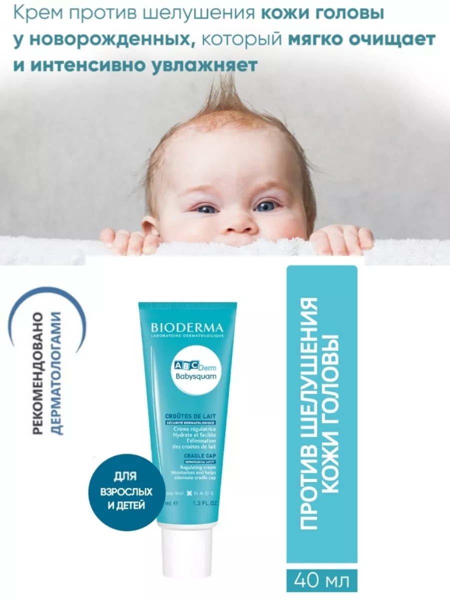 ABCDerm Babysquam Creme is a special baby cream for treating cradle cap. It contains acids that dissolve cradle cap. Its active ingredients also moisturize and nourish baby's skin. / The original formula of ABCDerm Babysquam includes two keratolytic agents: alactoarabinan and lactic acid ester, which help quickly exfoliate cradle cap without irritating baby's skin. / For optimal effectiveness, ABCDerm Babysquam contains moisturizing and soothing ingredients. / Created in strict accordance with the principles of dermatological safety, without fragrances, dyes, or parabens. / Convenient packaging allows for precise dosing of ABCDerm Babysquam, easy distribution, and avoids contact with eyes. / Ingredients: Malic acid ester provides the cream's keratoregulating effect. Glycerin and shea butter moisturize and nourish the skin. Arabinogalactan and malic acid esters have a dual keratolytic effect, gently removing flakes. Shea butter and glycerin moisturize and facilitate flake removal. / Directions: Apply the cream to the flaky scalp and massage gently. Leave on for 15-30 minutes and rinse thoroughly with ABCDerm Gentle Cleansing Gel. / Result: Your baby will quickly and permanently gain a clean, moisturized scalp.