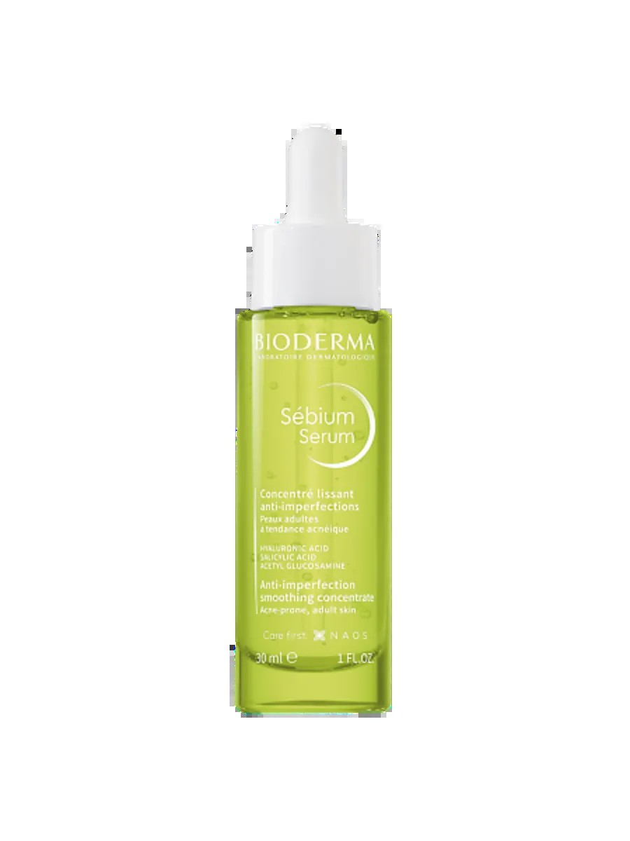 Bioderma Sebium Serum, an anti-imperfection, post-acne and wrinkle serum, reduces post-acne marks, tightens enlarged pores, and provides comprehensive care for mature skin prone to acne.