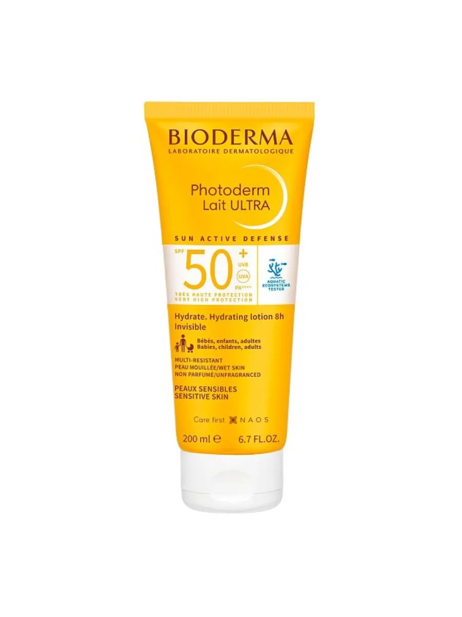 Солнцезащитное молочко Bioderma Photoderm Lait Ultra SPF50+ с очень высокой степенью защиты от солнца (защищает от UVB, UVA; PA++++) для чувствительной кожи лица и тела. Оказывает увлажняющее действие. Легкая, нелипкая текстура, становится бесцветным после нанесения. Хорошая переносимость кожей и слизистой глаз. Средство прошло дерматологический и офтальмологический контроль. Без отдушки. Водоустойчивое. Стойкое к поту, песку. Стойкое на влажной коже. Фотостабильное. Для взрослых и детей от 12 месяцев.
