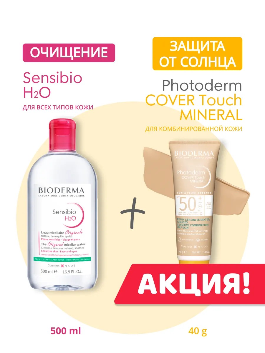 Bioderma Photoderm Cover touch Very light + Sensibio H2O 500 мл