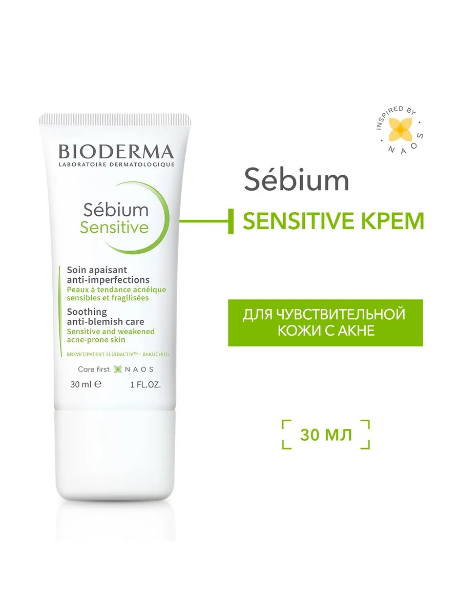 Bioderma Sébium Sensitive крем обеспечивает ежедневный успокаивающий уход за чувствительной кожей, склонной к акне. Средство успокаивает, увлажняет и устраняет покраснения на коже. Рекомендуется использовать крем Bioderma Sébium Sensitive в период медикаментозного лечения акне, например, с помощью бензоил пероксида. Он снижает чувствительность кожи, борется с чрезмерной сухостью и покраснениями и устраняет дискомфорт. Крем не скатывается и служит прекрасной базой под макияж.