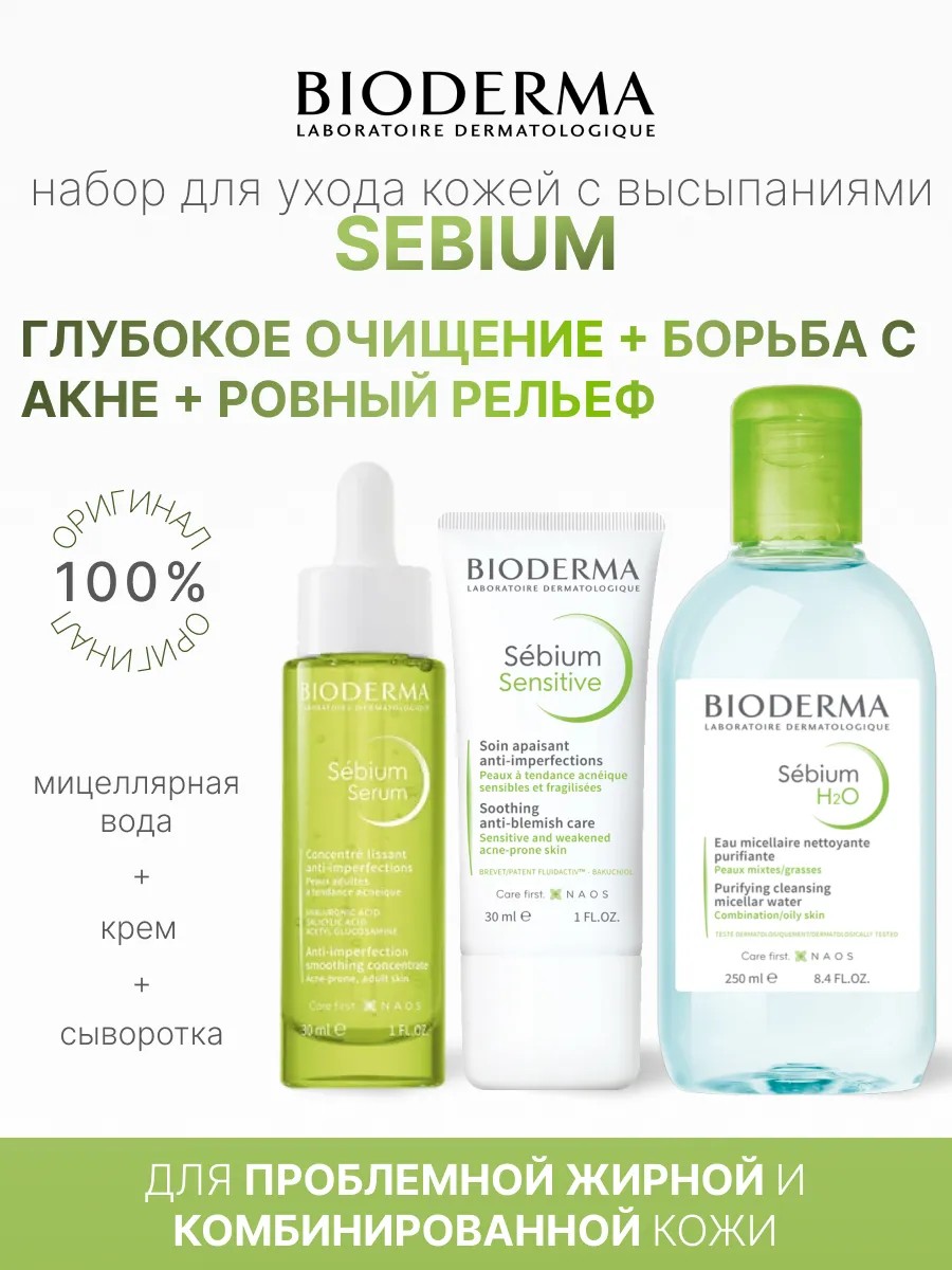 Bioderma Набор Sebium: Мицеллярная вода + Сыворотка + Крем Sensitive