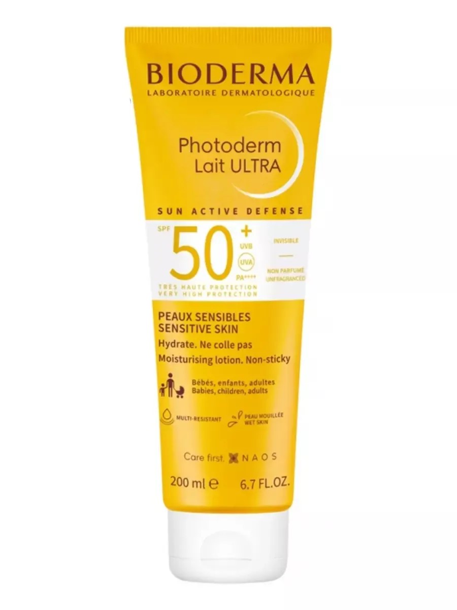 Ultra SPF50+ Sunscreen Milk with a very high sun protection (protects against UVB, UVA; PA++++) for sensitive skin of the face and body. Provides a moisturizing effect. Light, non-sticky texture, becomes colorless after application. Good tolerance by skin and mucous membranes of the eyes. The product has passed dermatological and ophthalmological tests. Fragrance-free. Waterproof. Resistant to sweat and sand. Long-lasting on damp skin. Photostable. ACTIVE INGREDIENTS: SUN ACTIVE DEFENSE: a high-tech solution for enhanced protection from UVA rays. The combination of UV filters and patented biological protection technology guarantee protection from UVA and UVB radiation. Maintains skin health during sun exposure. HOW TO USE: Apply a thick layer to dry or damp skin before sun exposure. Reapply regularly, including after swimming, to maintain protection. Apply to healthy skin. Keep newborns and small children away from the sun. Excessive sun exposure can be harmful to health, even with sunscreen.