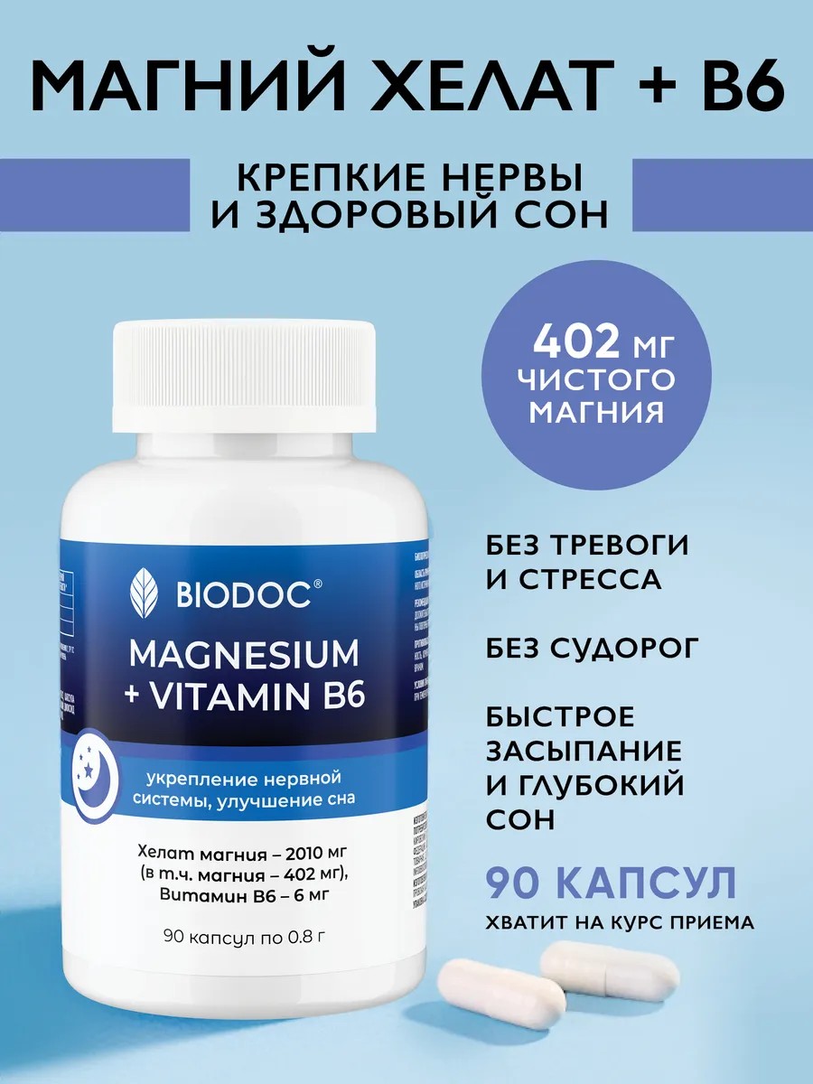 Поддержите себя в форме витаминами для нервной системы от BioDoc. Наш Магний Хелат содержит 402 мг чистого магния – это сбалансированная дозировка, которая поможет быстро гармонизировать ваше состояние при стрессе и бессоннице.