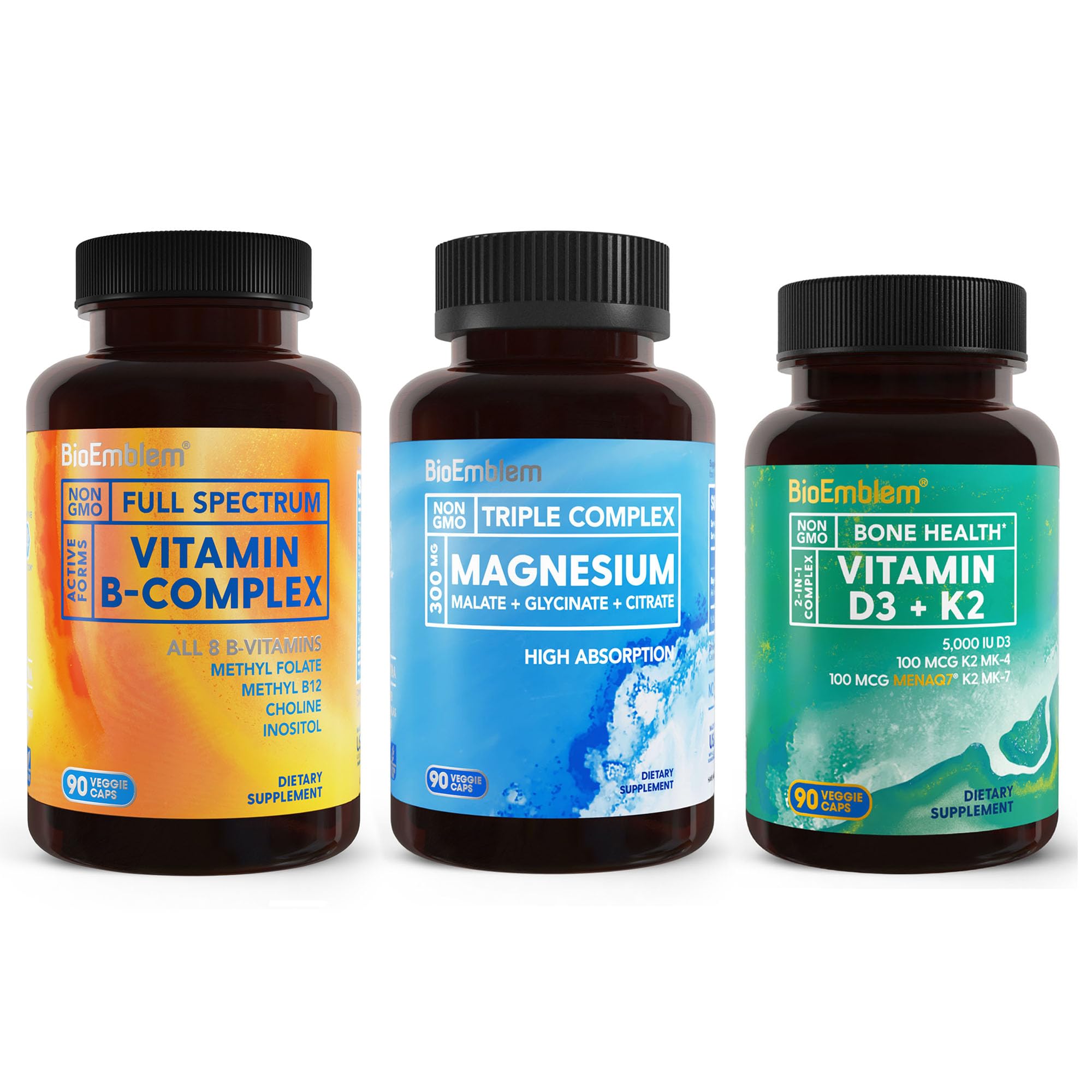 vitamin D3 in cholecalciferol form is the same form that we get from the sun that our bodies can absorb right away.*. Supports Healthy Nerves: Magnesium, especially in mag glycinate form, is an essential nutrient that supports healthy muscle and nerve function. This can help with muscles & legs at night, brain health, and mood.*. Maximum Absorption & Potent Magnesium Supplement: BioEmblem Triple Magnesium Complex features 300mg of three types of pure magnesium (Glycinate, Malate, Citrate). Each is chelate or highly absorbable for maximum bioavailability. Our formula is easy on the stomach and "non-buffered," meaning this blend isn't diluted with less expensive and less absorbable magnesium oxide.*.