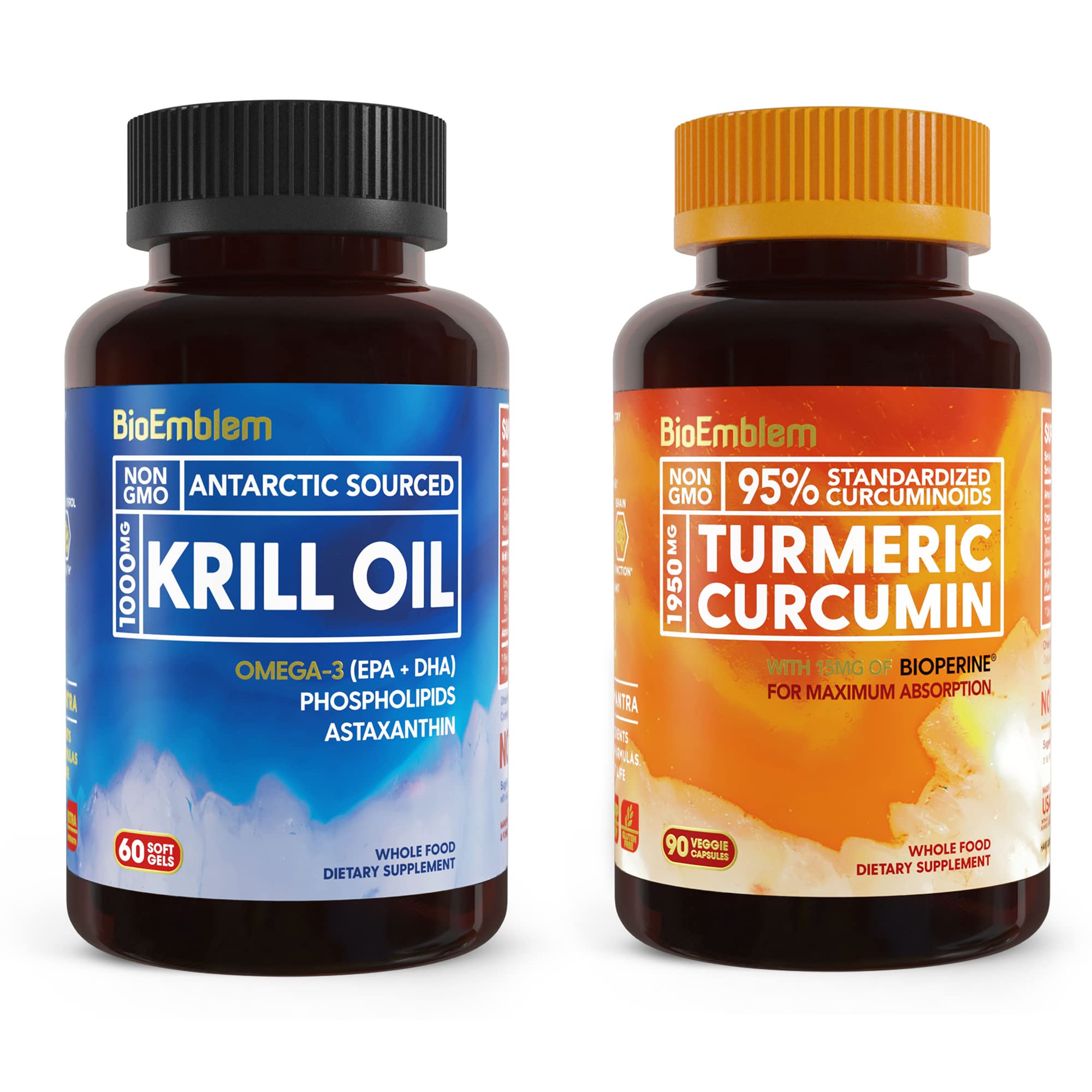 BIOEMBLEM : BioEmblem Krill Oil is sourced from Antarctica and bottled in the USA at an NSF-registered, cGMP-certified facility in California. PROMOTES HEALTHY JOINT & MOBILITY: Turmeric Curcumin contains compounds that promote healthy joints. In turn, this helps supports muscle function and overall wellbeing.*. SUPERIOR ABSORPTION FORM: Krill oil's phospholipid form of omega-3s can dissolve in water, allowing it to be better absorbed and more bioavailable compared to fish oils' triglycerides.* Krill oil also avoids the fishy aftertaste and odor associated with fish oils. PURE INGREDIENTS, POTENT FORMULA: BioEmblem's formula is made with organic turmeric root powder, uses only non-GMO ingredients, and is derived from natural and whole food sources. This formula incorporates an extra strength extract standardized to 95% curcuminoids and BioPerine to maximize absorption into the bloodstream by up 20x. Each capsule is vegan friendly and gluten free as well.*. ANTARCTIC KRILL OIL, RICH IN OMEGA-3s: BioEmblem's premium krill oil is sustainably harvested from the pristine waters of the Antarctic Ocean. Each 1000mg serving delivers 340mg of essential omega-3 fatty acids, 136mg of EPA, 64mg of DHA, along with phospholipids and astaxanthin.