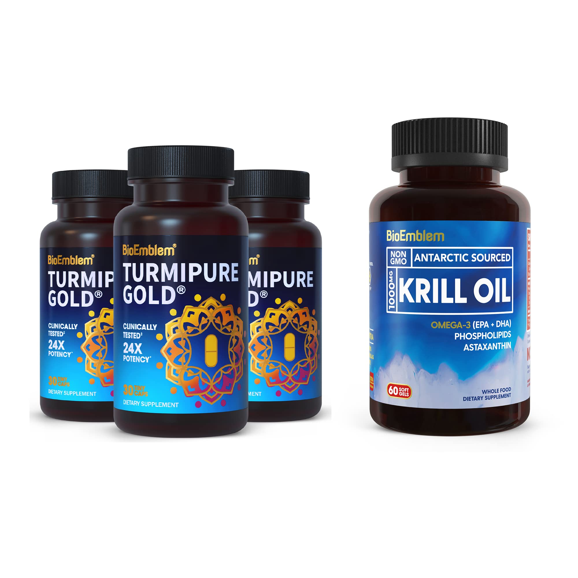 SUPPORTS HEALTHY BRAIN, HEART, AND JOINT HEALTH: The omega-3s (DHA and EPA) and astaxanthin found in krill oil have antioxidant properties and help maintain healthy cognitive function, promote cardiovascular health, and support a healthy inflammatory response for joint relief. Scientifically Proven - Superior Bioavailability: Most turmeric curcumin formulas use large volume doses to make up for the fact that very little curcumin in them is actually absorbed into the blood. The curcumin in TurmiPure Gold extract on the other hand is much more highly absorbed. Human clinical trials have shown that just a small 300mg of TurmiPure Gold delivered more measurable curcuminoids into the bloodstream in 24 hours than other popular turmeric extract formulas in larger doses. TurmiPure Gold - Clinically Studied For 24x Better Absorption: When it comes to turmeric's benefits, curcuminoid absorption is what matters the most. TurmiPure Gold is a patented turmeric extract made through a unique microemulsion process. This extract is clinically proven by studies to be 24x more bioavailable than standard turmeric curcumin extract with black pepper. Just 1 small capsule a day replaces 4 large standard turmeric supplement capsules. SUPERIOR ABSORPTION FORM: Krill oil's phospholipid form of omega-3s can dissolve in water, allowing it to be better absorbed and more bioavailable compared to fish oils' triglycerides.* Krill oil also avoids the fishy aftertaste and odor associated with fish oils. ANTARCTIC KRILL OIL, RICH IN OMEGA-3s: BioEmblem's premium krill oil is sustainably harvested from the pristine waters of the Antarctic Ocean. Each 1000mg serving delivers 340mg of essential omega-3 fatty acids, 136mg of EPA, 64mg of DHA, along with phospholipids and astaxanthin.