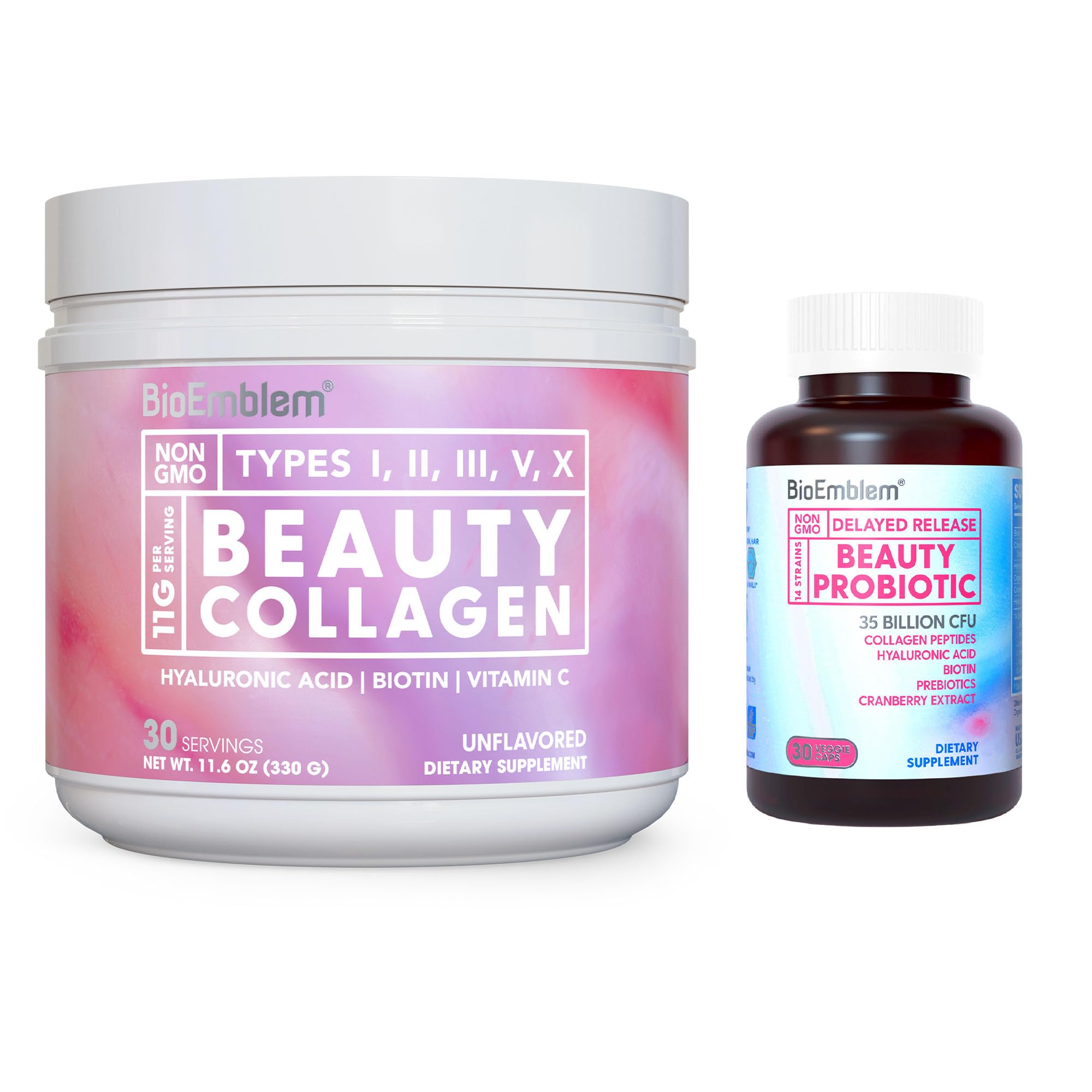 Triple-Action Beauty Support: 2500mcg of Biotin, a vital B-vitamin, is essential for healthy nails and hair. 80mg of Hyaluronic Acid support skin hydration, promoting a youthful appearance. And lastly, 100mg of Vitamin C supports collagen, skin elasticity and overall immune health.*. 11G Of Premium Collagen Type I, II, III, V, And X: BioEmblem combines a powerful 8900mg of hydrolyzed bovine collagen with 1850mg of fish collagen, working in harmony to support your skin, boost your hair and nails, and support your joints and bones. This comprehensive formula, featuring Types I, II, III, V, and X collagen, offers a holistic approach to total body health and, targeting multiple areas for a truly radiant you.*. Vaginal Flora Balance & Urinary Boost For Women: This womens probiotic is formulated with 14 clinically studied strains like acidophilus chosen specifically for supporting digestion, bloating relief, pH balance, immune system, and vaginal flora balance in women. It also includes inulin prebiotics that provide the nutrition for probiotics to be more effective, and cranberry extract with its powerful antioxidants to help support urinary tract and bladder health.*. Glowing Skin & Healthy Hair, Nails: Our blend provides the essential beauty building blocks you need by combining biotin, hyaluronic acid, and hydrolyzed collagen supplements. These key vitamins and minerals work in harmony to promote radiant skin, gorgeous hair and beautiful nails from the inside out. All of these nutrients are vital for overall health and a youthful appearance.*. Powerful Immune System & Beauty Supplement: 35 Billion CFUs, 14 clinically studied & patented Lactobacillus and Bifido strains made in the USA, and 6 hair skin and nails vitamins in this one-a-day womens probiotics. This doctor formulated daily probiotic for women is the only one with ingredients to target both probiotic and beauty health needs by supporting digestive health, yeast balance, vaginal health, gut health, healthy skin, and hair growth.*.