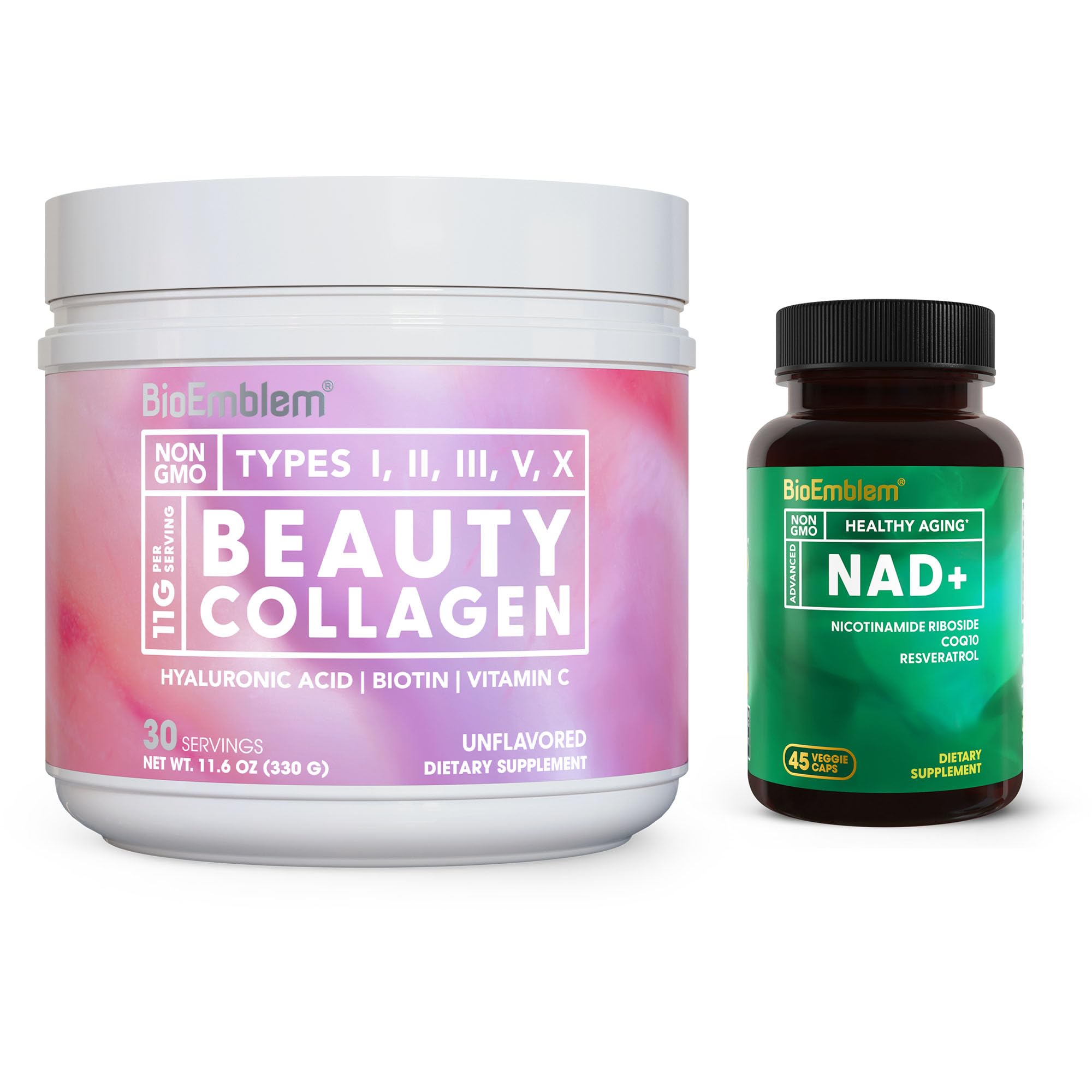 Triple-Action Beauty Support: 2500mcg of Biotin, a vital B-vitamin, is essential for healthy nails and hair. 80mg of Hyaluronic Acid support skin hydration, promoting a youthful appearance. And lastly, 100mg of Vitamin C supports collagen, skin elasticity and overall immune health.*. 11G Of Premium Collagen Type I, II, III, V, And X: BioEmblem combines a powerful 8900mg of hydrolyzed bovine collagen with 1850mg of fish collagen, working in harmony to support your skin, boost your hair and nails, and support your joints and bones. This comprehensive formula, featuring Types I, II, III, V, and X collagen, offers a holistic approach to total body health and, targeting multiple areas for a truly radiant you.*. Brain Health And Longevity with Resveratrol: Resveratrol, a potent antioxidant found in grapes and certain berries, supports cellular health, heart health, cognitive function, and helps with oxidative stress for longevity. This powerful compound can help support a healthy inflammation response, support blood health, support cells from damage, and enhance overall well-being.*. 3-In-1 Fomula for Cellular Energy: Our effective dosage blend of Nicotinamide Riboside, CoQ10, and Resveratrol works synergistically to promote cellular energy, reduce oxidative stress, promote vitality, and support healthy aging. NAD+ boosts cellular energy, CoQ10 enhances mitochondrial function for energy, and Resveratrol supports cells from damage.*. Boost NAD+ With NR For Aging Support: BioEmblem's NAD+ contains 300mg of Nicotinamide Riboside (NR) that is a precursor and helps raise the body's NAD+ levels to promote healthy cell activity, energy, and whole body wellness. NAD+ is a crucial coenzyme involved in numerous cellular processes, but as we age, our levels decline, leading to decreased cellular energy and accelerated aging.*.