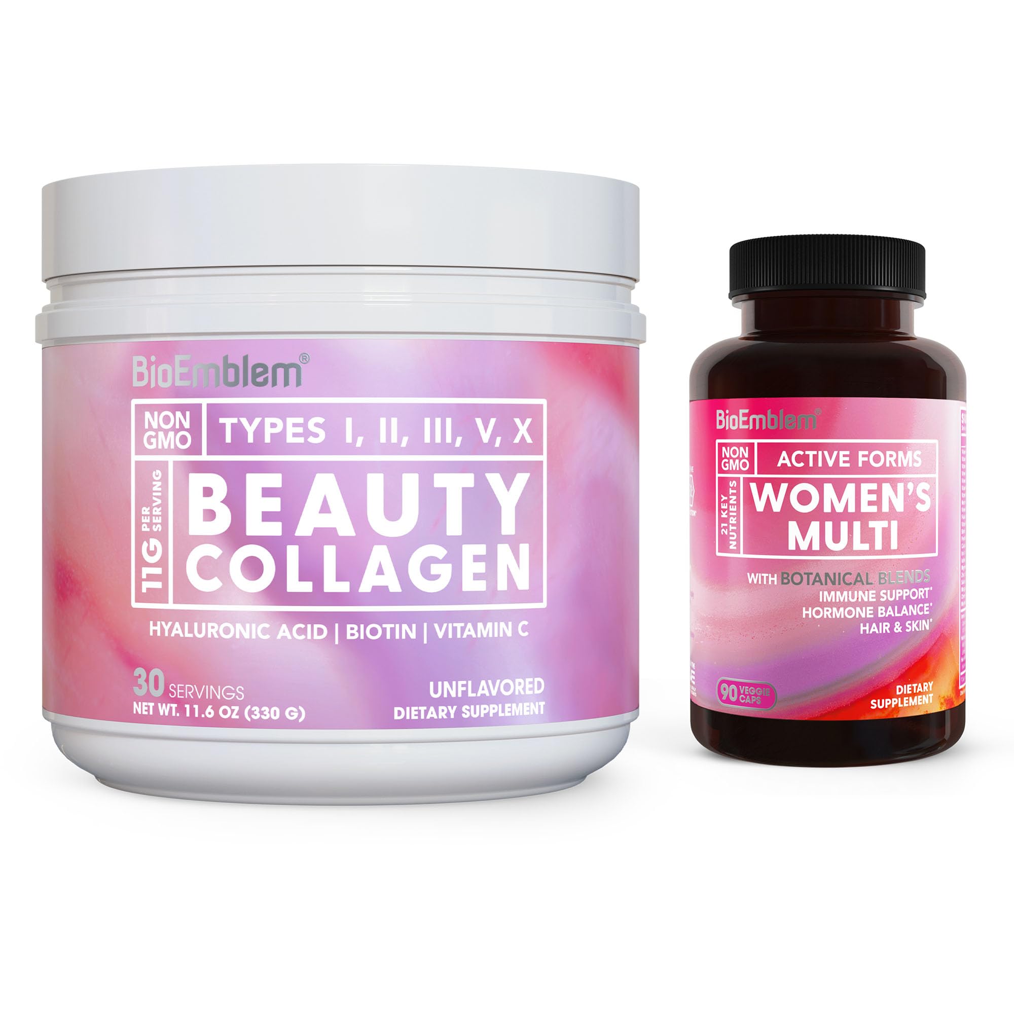 11 Extracts & Veggies For Hair, Hormonal Balance, Immunity: A powerful range of herbal extracts like Elderberry, Echinacea, Dong Quia, and Black Cohosh supports hormone balance and a healthy immune system. Proven ingredients like type-II collagen,. 21 Key Nutrients For All Lifestyles: This women multivitamin formula is science-backed and contains vitamin D, B12, B6, K2, vitamin C and more along with essential minerals like magnesium, zinc - most are at 100% Daily Value or more. Just two capsules per day to help fill nutritional needs and feel healthy, balanced, and vibrant.*. Promote Healthy Bones, Muscles & Joints: Our formula combines 20mg of chicken eggshell membrane collagen with 50mg of chicken bone broth protein to promote optimal joint function, cartilage health, and muscle strength. This formula supports healthy muscles and workout recovery.*. Triple-Action Beauty Support: 2500mcg of Biotin, a vital B-vitamin, is essential for healthy nails and hair. 80mg of Hyaluronic Acid support skin hydration, promoting a youthful appearance. And lastly, 100mg of Vitamin C supports collagen, skin elasticity and overall immune health.*. 11G Of Premium Collagen Type I, II, III, V, And X: BioEmblem combines a powerful 8900mg of hydrolyzed bovine collagen with 1850mg of fish collagen, working in harmony to support your skin, boost your hair and nails, and support your joints and bones. This comprehensive formula, featuring Types I, II, III, V, and X collagen, offers a holistic approach to total body health and, targeting multiple areas for a truly radiant you.*.