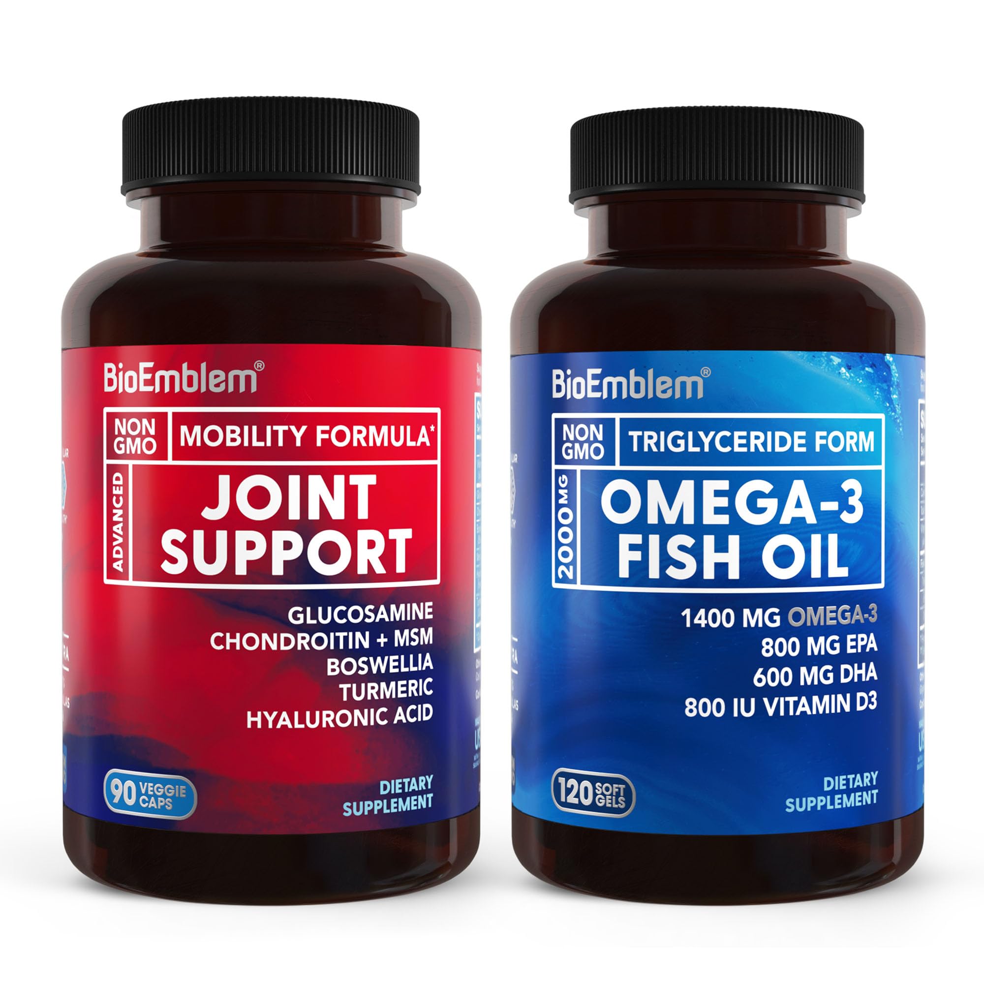 Promote Healthy Joints As You Age: BioEmblem's Joint Support supplement is a potent combination of ingredients designed to promote joint wellness and support healthy joint tissue as you age. Support healthy collagen production in the joints with the help of Boswellia and Hyaluronic Acid.*. Nourish Joints From Inside Out: BioEmblem's Joint Support Mobility Formula is formulated with 1500 MG Glucosamine and 525 MG Chondroitin + MSM for enhanced joint health by helping the body maintain healthy cartilage. Support comfort in your back, knees, and hands.*. Easy To Swallow Small Softgels: While other brands have massive softgels that are difficult to take, BioEmblem uses much smaller 10 Oval size softgels that go down easily. Our softgels are also enteric coated to survive the stomach acid and minimize fishy burps, plus our fish oil is in high absorption triglyceride form.*. 2000MG Of Sustainable Omega-3: Each serving provides 2000mg of high-potency fish oil with 1400mg of Omega-3 fatty acids from 800mg EPA and 600mg DHA - one of the highest doses you'll find. We've also included a daily value amount of Vitamin D for total wellness. Our fish oil is sustainably sourced entirely from anchovies and verified by the Friends Of The Sea (FOS).*.