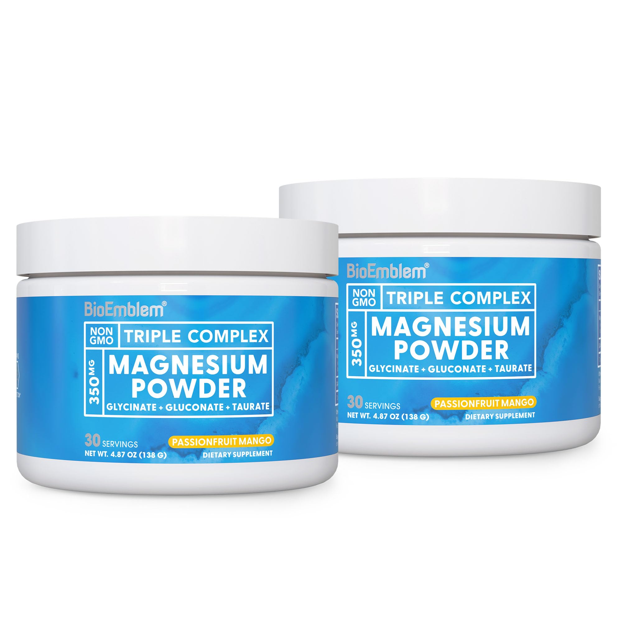Triple Lab Tested Made In the USA BioEmblem Triple Magnesium Powder is proudly made in an NSF-registered cGMP facility and rigorously tested during production for guaranteed purity and accuracy. This ensures a premium magnesium supplement that is vegan, non-GMO, gluten-free, and completely free from fillers, artificial ingredients, preservatives, or stearates. . Optimized for Muscle Nerve Support Magnesium is a powerhouse, fueling 300 body reactions from nerve function to energy production. Magnesium Glycinate and GABA work synergistically to guide you deeply into sleep. Magnesium Gluconate directly supports cellular energy and healthy nerves plus muscles. Magnesium Taurate further supports calm for a greater sense of composure and rest. . Dissolves Instantly – Zero Sugar – Passionfruit Mango Our team spent over 6 months testing dozens of samples to create the perfect magnesium powder. Just mix one small scoop into 8 oz of water or your preferred liquid for a drink that helps relax muscles. Lightly sweetened with monk fruit extract and using only natural flavors colors, our magnesium powder mixes instantly into almost any liquid. . Support Calm at Night with Added GABA This unique powder includes GABA, a naturally occurring amino acid that helps support brain activity. GABA with chelated magnesium works to promote feelings of calm and help relax muscles. This blend is the perfect addition to your evening wind-down ritual or for encouraging clarity during a mid-day break. . 3 High Absorption Magnesiums to Rest Relax Just 1 scoop of our expertly crafted blend delivers 350mg of highly absorbable magnesium Glycinate, Gluconate, and Taurate – these bioavailable forms are designed to meet your body's daily needs and support cellular health, brain function, and immune health. .