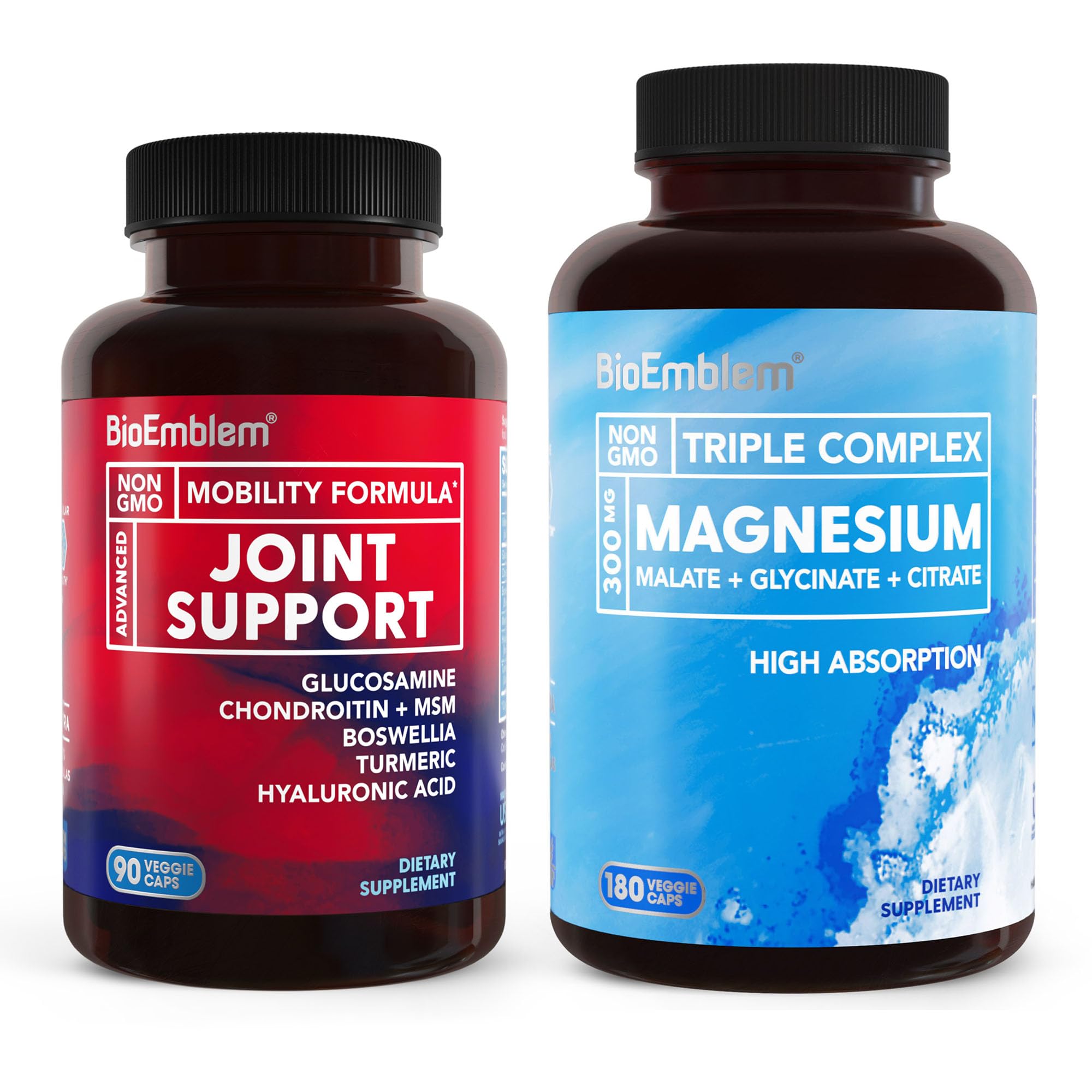 Nourish Joints From Inside Out: BioEmblem's Joint Support Mobility Formula is formulated with 1500 MG Glucosamine and 525 MG Chondroitin + MSM for enhanced joint health by helping the body maintain healthy cartilage. Support comfort in your back, knees, and hands.*. Supports Healthy Nerves: Magnesium, especially in mag glycinate form, is an essential nutrient that supports healthy muscle and nerve function. This can help with muscles & legs at night, brain health.*. Maximum Absorption & Potent Magnesium Supplement: BioEmblem Triple Magnesium Complex features 300mg of three types of pure magnesium (Glycinate, Malate, Citrate). Each is chelate or highly absorbable for maximum bioavailability. Our formula is easy on the stomach and "non-buffered," meaning this blend isn't diluted with less expensive and less absorbable magnesium oxide.*.