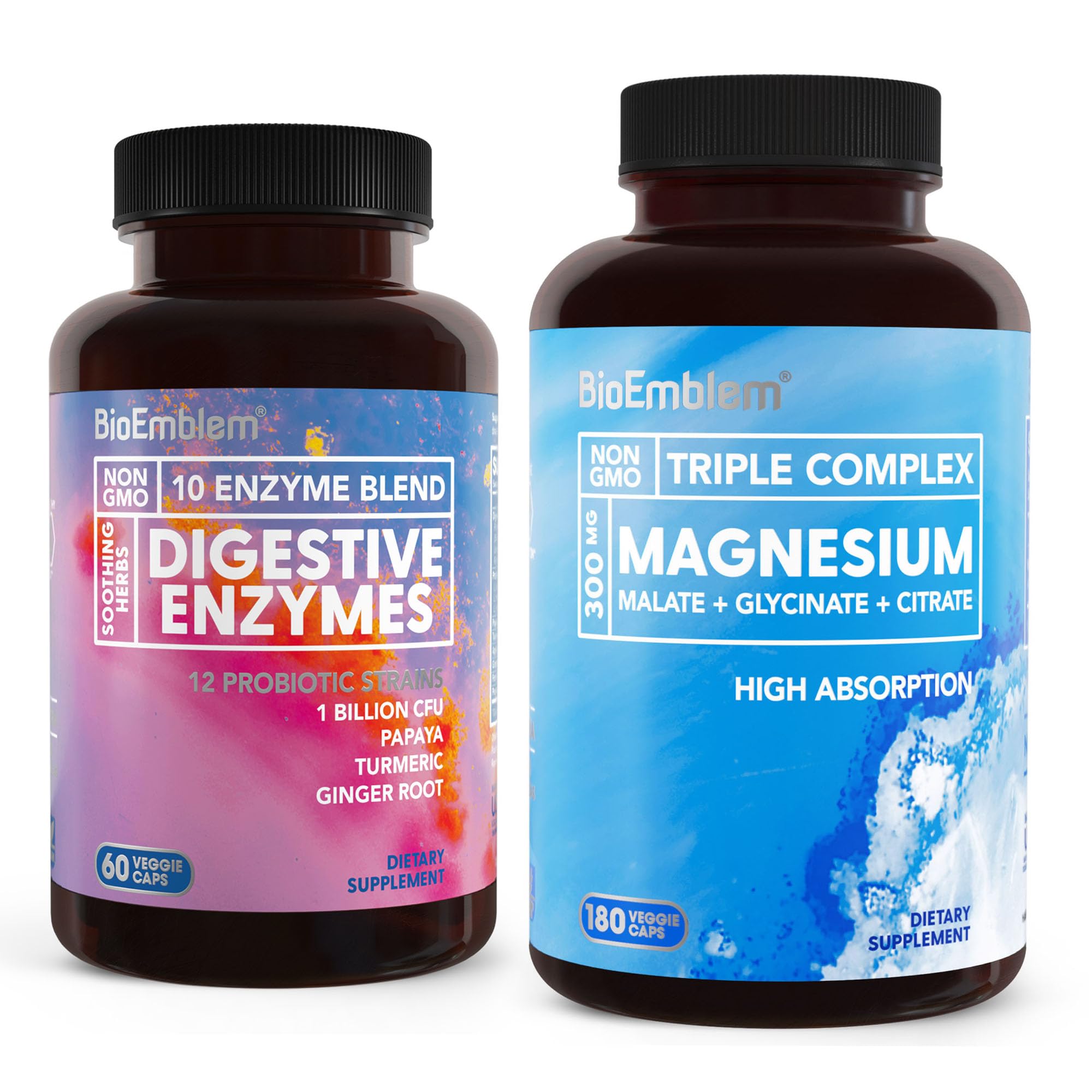 BioEmblem Triple Magnesium Complex 180 Capsules & Digestive Enzymes - 10 Enzymes w/ 12 Strain 1 Billion CFU Probiotics for Nutrient Absorption 60 Capsules