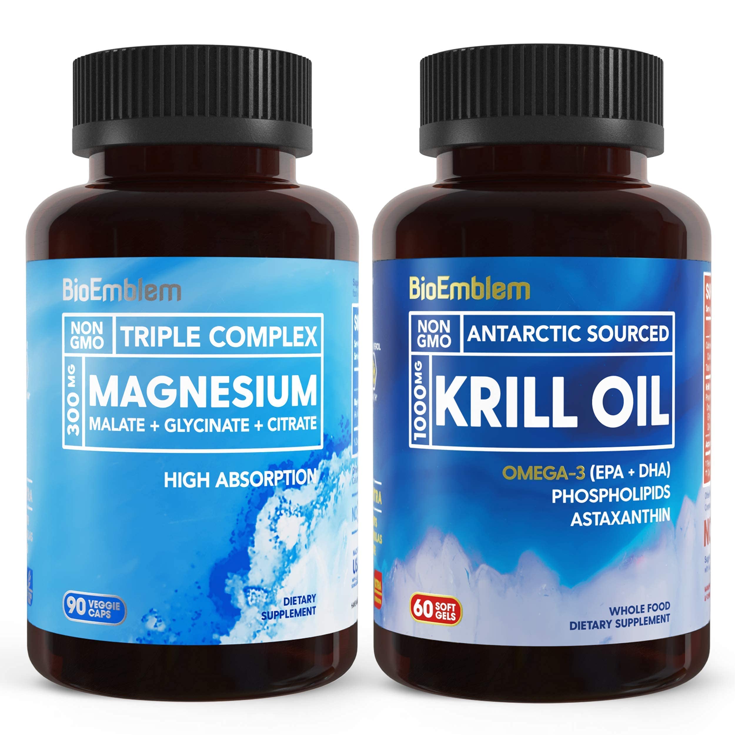 PROMOTES HEART HEALTH AND ENERGY PRODUCTION: As a cofactor in hundreds of enzyme reactions, magnesium, especially magnesium malate, supports the metabolism of nutrients for cellular energy production. Magnesium supplements also help maintain normal blood pressure and heart rhythm to support overall cardiovascular health.*. SUPERIOR ABSORPTION FORM: Krill oil's phospholipid form of omega-3s can dissolve in water, allowing it to be better absorbed and more bioavailable compared to fish oils' triglycerides.* Krill oil also avoids the fishy aftertaste and odor associated with fish oils. Maximum Absorption & Potent Magnesium Supplement: BioEmblem Triple Magnesium Complex features 300mg of three types of pure magnesium (Glycinate, Malate, Citrate). Each is chelate or highly absorbable for maximum bioavailability. Our formula is easy on the stomach and "non-buffered," meaning this blend isn't diluted with less expensive and less absorbable magnesium oxide.*. BioEmblem Antarctic Krill Oil Supplement | 1000mg | Omega-3 Oil with High Levels of EPA + DHA, Astaxanthin, and Phospholipids | No Fishy Aftertaste | 60-Count Non-GMO Softgels. BioEmblem Triple Magnesium Complex | 300mg of Magnesium Glycinate, Malate, & Citrate for Muscle Relaxation, Sleep, Heart, & Energy | High Absorption | Vegan, Non-GMO | 90 Capsules.