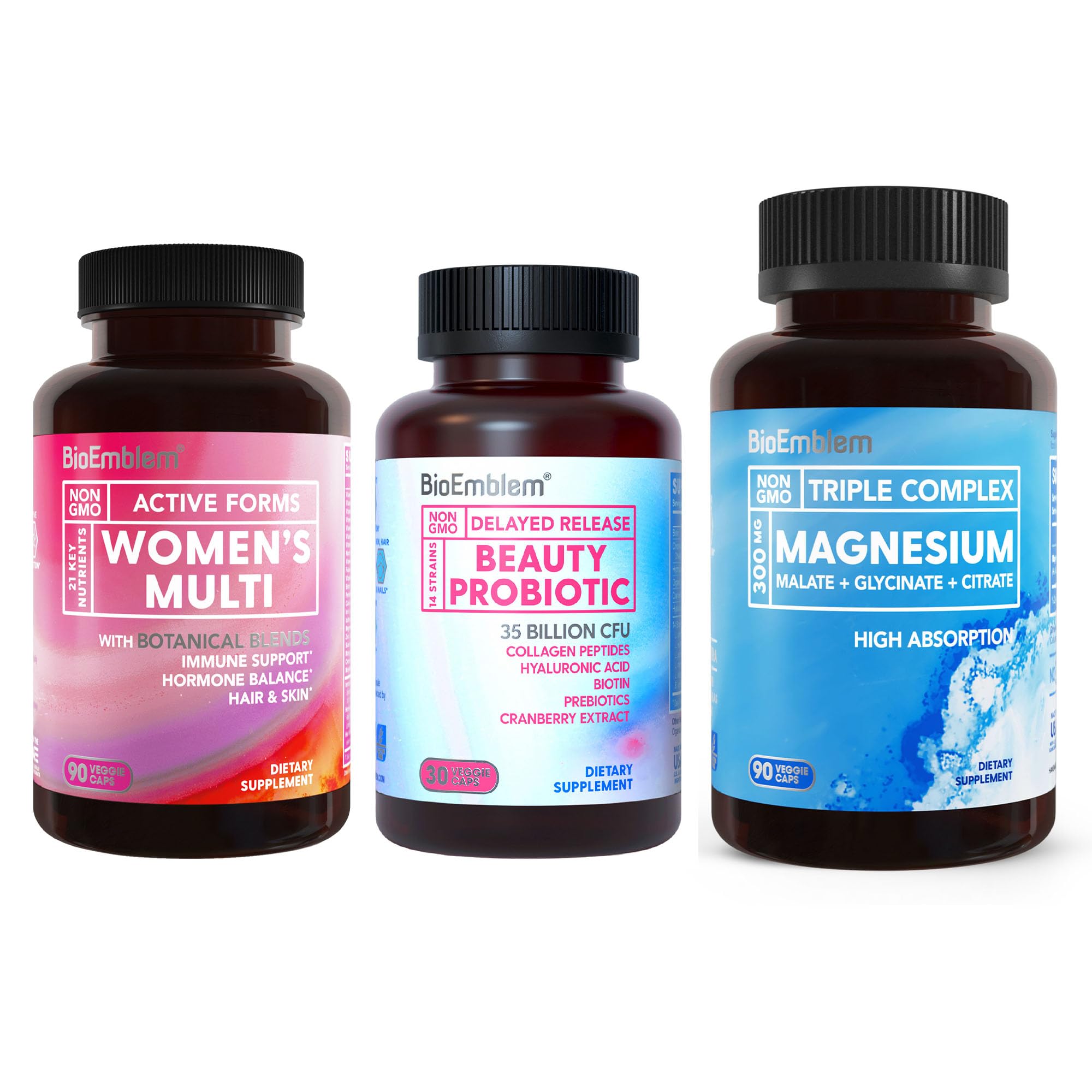 21 Key Nutrients For All Lifestyles: This women multivitamin formula is science-backed and contains vitamin D, B12, B6, K2, vitamin C and more along with essential minerals like magnesium, zinc - most are at 100% Daily Value or more. Just two capsules per day to help fill nutritional needs and feel healthy, balanced, and vibrant.*. Glowing Skin & Healthy Hair, Nails: Our blend provides the essential beauty building blocks you need by combining biotin, hyaluronic acid, and hydrolyzed collagen supplements. These key vitamins and minerals work in harmony to promote radiant skin, gorgeous hair and beautiful nails from the inside out. All of these nutrients are vital for overall health and a youthful appearance.*. Powerful Immune System & Beauty Supplement: 35 Billion CFUs, 14 clinically studied & patented Lactobacillus and Bifido strains made in the USA, and 6 hair skin and nails vitamins in this one-a-day womens probiotics. This doctor formulated daily probiotic for women is the only one with ingredients to target both probiotic and beauty health needs by supporting digestive health, yeast balance, vaginal health, gut health, healthy skin, and hair growth.*. Supports Healthy Nerves: Magnesium, especially in mag glycinate form, is an essential nutrient that supports healthy muscle and nerve function. This can help with muscles & legs at night, brain health*. Maximum Absorption & Potent Magnesium Supplement: BioEmblem Triple Magnesium Complex features 300mg of three types of pure magnesium (Glycinate, Malate, Citrate). Each is chelate or highly absorbable for maximum bioavailability. Our formula is easy on the stomach and "non-buffered," meaning this blend isn't diluted with less expensive and less absorbable magnesium oxide.*.