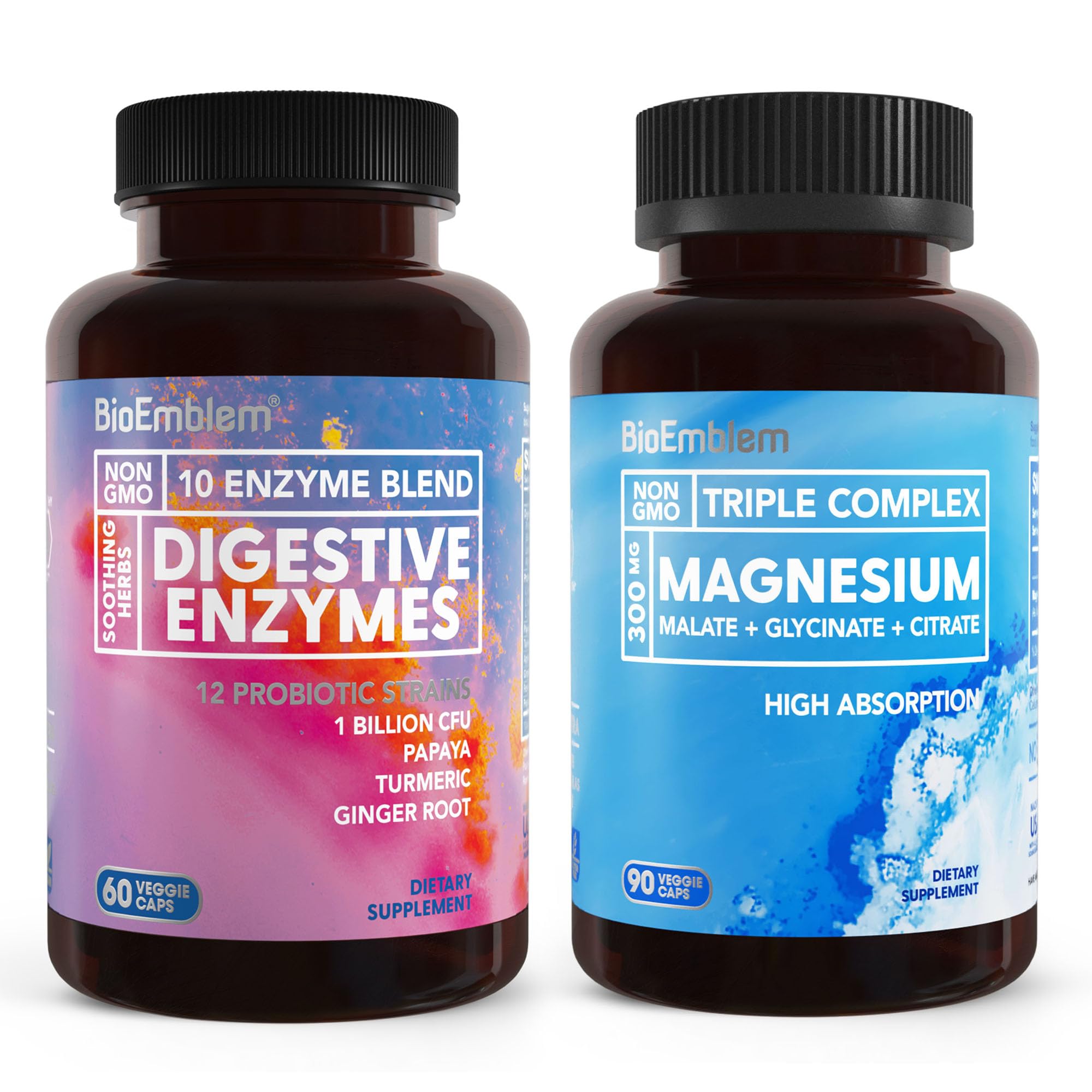 1 Billion CFU Probiotics For Digestion: 12 meticulously selected probiotic strains to deliver a comprehensive digestive boost and foster a harmonious gut environment. By nurturing a thriving microbiome, our digestive enzymes with probiotics helps with gas and bloating relief, promotes regularity and helps you feel your best.*. 10 Enzymes for Happy Gut: This triple-action formula, features a potent 125mg dose of essential enzymes like amylase, protease, and lipase, to break down carbohydrates, proteins, and fats for reduced meal discomfort and less bloating. By optimizing nutrient breakdown, our powerful enzyme blend enhances absorption, ensuring your body receives the full benefits of every meal.*. Promotes Heart Health And Energy Production: As a cofactor in hundreds of enzyme reactions, magnesium, especially magnesium malate, supports nutrient intake for cellular energy production. Magnesium supplements also help to support overall cardiovascular health.*. Supports Healthy Nerves: Magnesium, especially in mag glycinate form, is an essential nutrient that supports healthy muscle and nerve function. This can help with muscles & legs at night, brain health*. Maximum Absorption & Potent Magnesium Supplement: BioEmblem Triple Magnesium Complex features 300mg of three types of pure magnesium (Glycinate, Malate, Citrate). Each is chelate or highly absorbable for maximum bioavailability. Our formula is easy on the stomach and "non-buffered," meaning this blend isn't diluted with less expensive and less absorbable magnesium oxide.*.