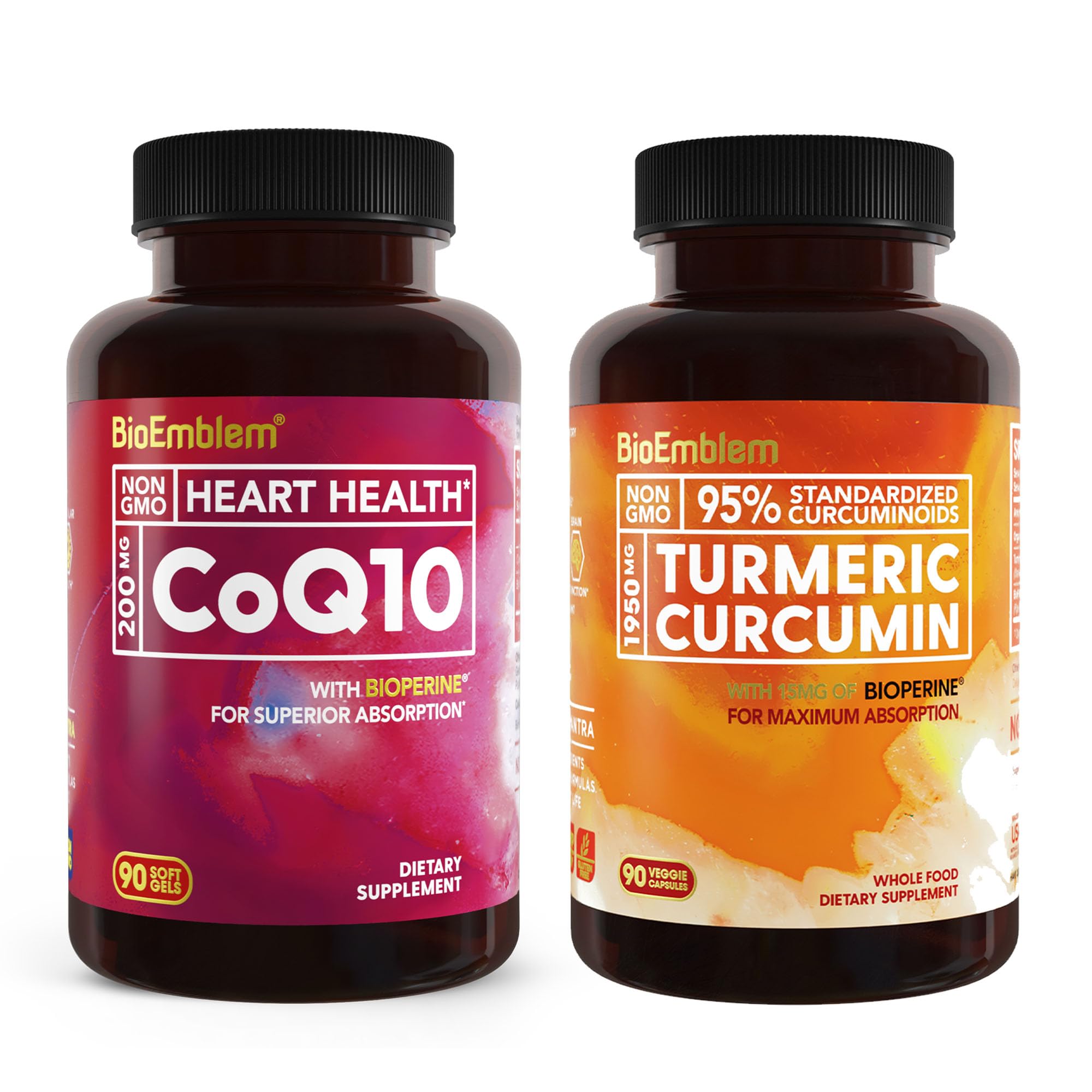 Essential To Energy Production: CoQ10 plays a vital role in the normal function of cellular energy production.* Maintaining healthy CoQ10 levels, which normally decline with age, supports physical performance and endurance. Our CoQ10 coenzyme supplement supports all cells of the body.*. BioEmblem's Superior Formula: BioEmblem naturally sources pure CoQ10 (coenzyme q10) that is biologically identical to the CoQ10 found in the human body so it is highly absorbed. * Our formula also includes BioPerine patented black pepper extract to further enhance CoQ10 absorption and bioavailability.*. ANTIOXIDANT SUPPORT AND IMMUNITY: Curcuminoids have powerful antioxidant properties that support healthy cells and skin. In addition, Curcumin's molecular structure supports the body's natural immune system and healthy brain function.*. PROMOTES HEALTHY JOINT & MOBILITY: Turmeric Curcumin contains compounds that promote healthy joints. In turn, this helps supports muscle function and overall wellbeing.*. PURE INGREDIENTS, POTENT FORMULA: BioEmblem's formula is made with organic turmeric root powder, uses only non-GMO ingredients, and is derived from natural and whole food sources. This formula incorporates an extra strength extract standardized to 95% curcuminoids and BioPerine to maximize absorption into the bloodstream by up 20x. Each capsule is vegan friendly and gluten free as well.*.