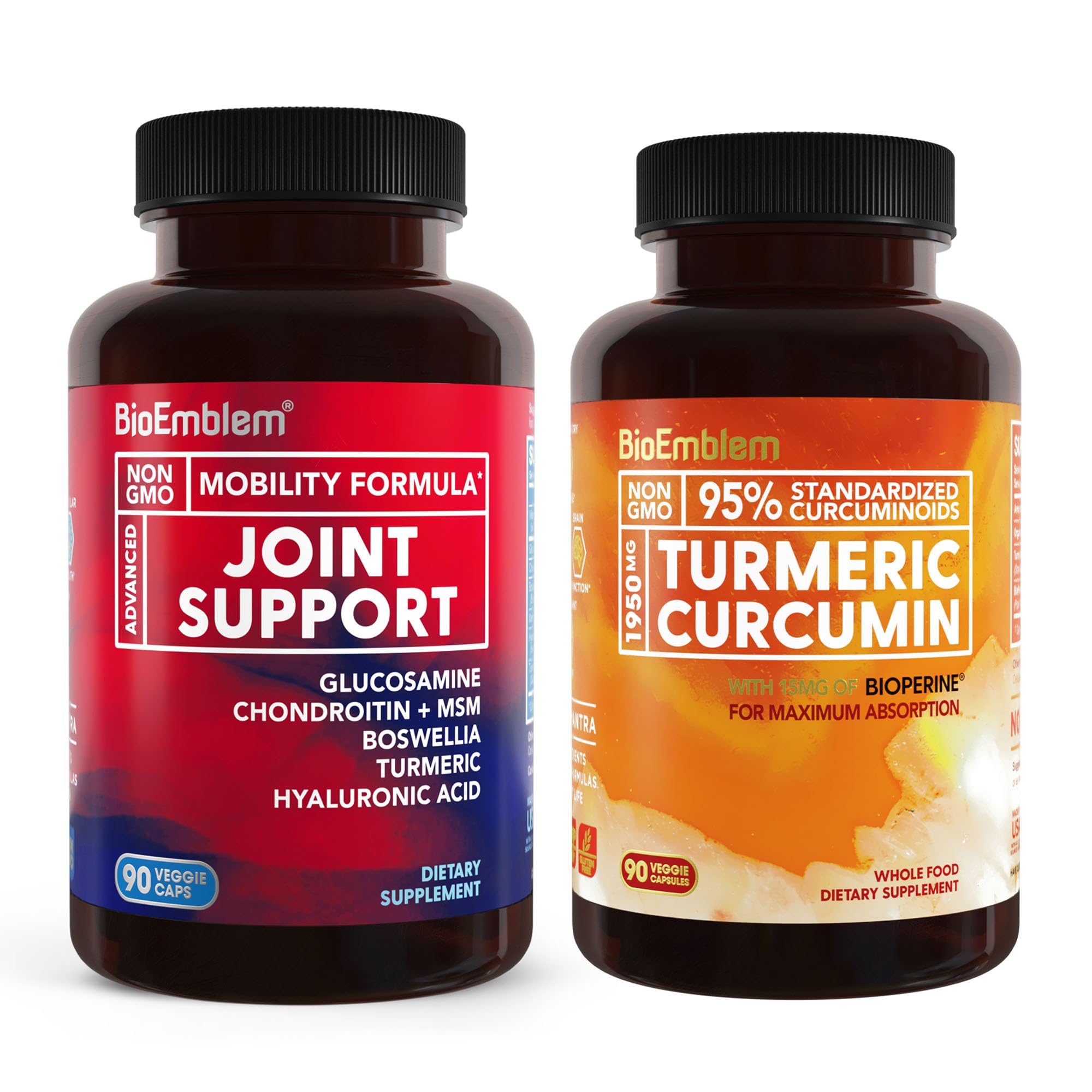 Nourish Joints From Inside Out: BioEmblem's Joint Support Mobility Formula is formulated with 1500 MG Glucosamine and 525 MG Chondroitin + MSM for supporting joint health by helping the body maintain healthy cartilage. Support comfort in your back, knees, and hands.*. PROMOTES HEALTHY JOINT & MOBILITY: Turmeric Curcumin contains compounds that promote healthy joints. In turn, this helps supports muscle function and overall wellbeing.*. PURE INGREDIENTS, POTENT FORMULA: BioEmblem’s formula is made with organic turmeric root powder, uses only non-GMO ingredients, and is derived from natural and whole food sources. This formula incorporates an extra strength extract standardized to 95% curcuminoids and BioPerine to maximize absorption into the bloodstream by up 20x. Each capsule is vegan friendly and gluten free as well. *.