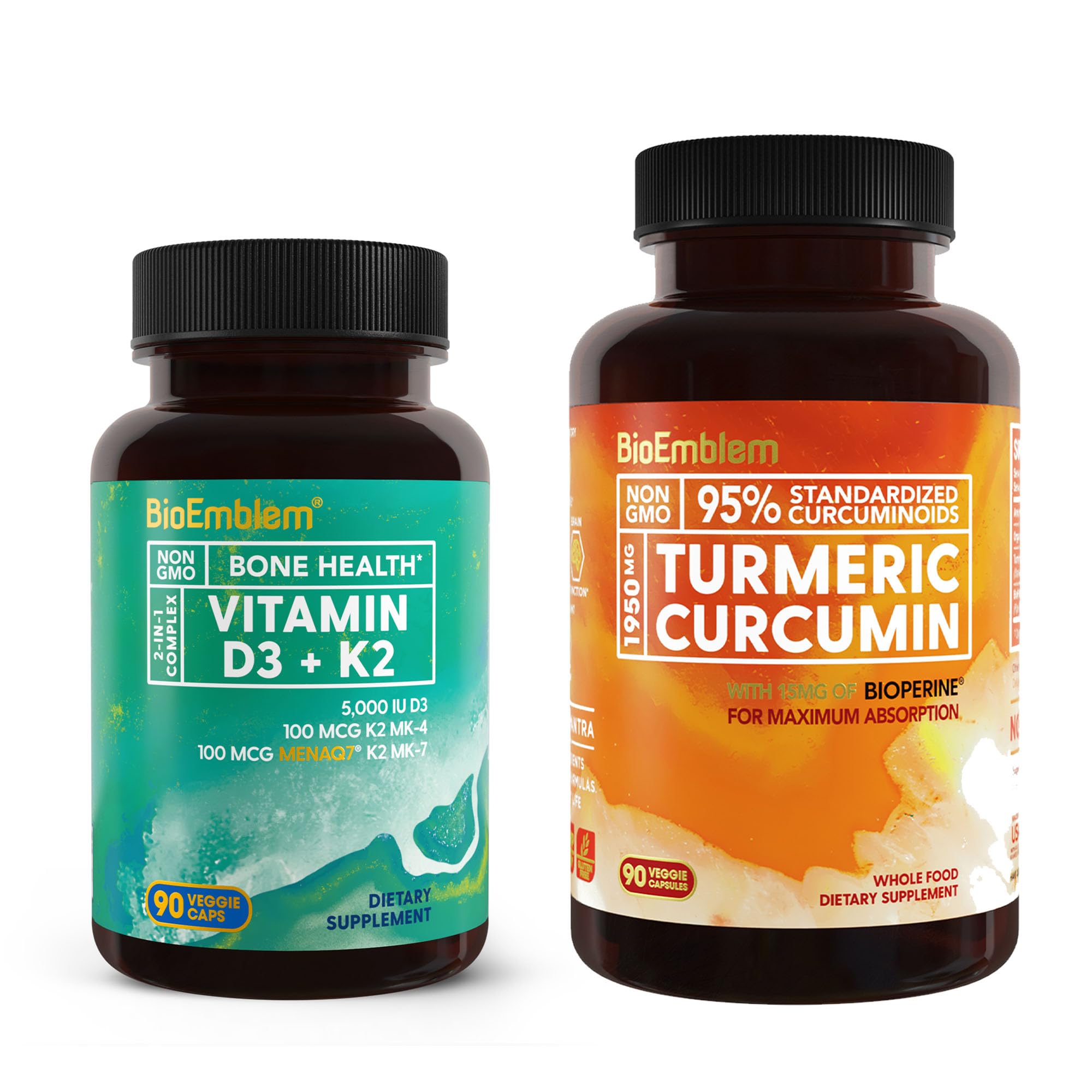 Two Types Of K2: Unlike other brands, we include both MK-7 and MK-4 forms of K2 for the complete range of benefits. MK-4 absorbs quickly, while MK-7 is also highly absorbable and stays active in your body much longer. Our formula uses the patented MenaQ7 which is a clinically studied MK-7 derived from chickpeas for max absorption.*. Best Absorbed Forms Of D3 And K2: Each capsule contains 5000 IU of vitamin D3, 100mcg of vitamin K2 MK-7, and 100mcg of vitamin K2 MK-4 for a complete 3-in-1 support formula. Our vitamin D3 in cholecalciferol form is the same form that we get from the sun that our bodies can absorb right away.*. PROMOTES HEALTHY JOINT & MOBILITY: Turmeric Curcumin contains compounds that promote healthy joints. In turn, this helps supports muscle function and overall wellbeing.*. PURE INGREDIENTS, POTENT FORMULA: BioEmblem’s formula is made with organic turmeric root powder, uses only non-GMO ingredients, and is derived from natural and whole food sources. This formula incorporates an extra strength extract standardized to 95% curcuminoids and BioPerine to maximize absorption into the bloodstream by up 20x. Each capsule is vegan friendly and gluten free as well. *.