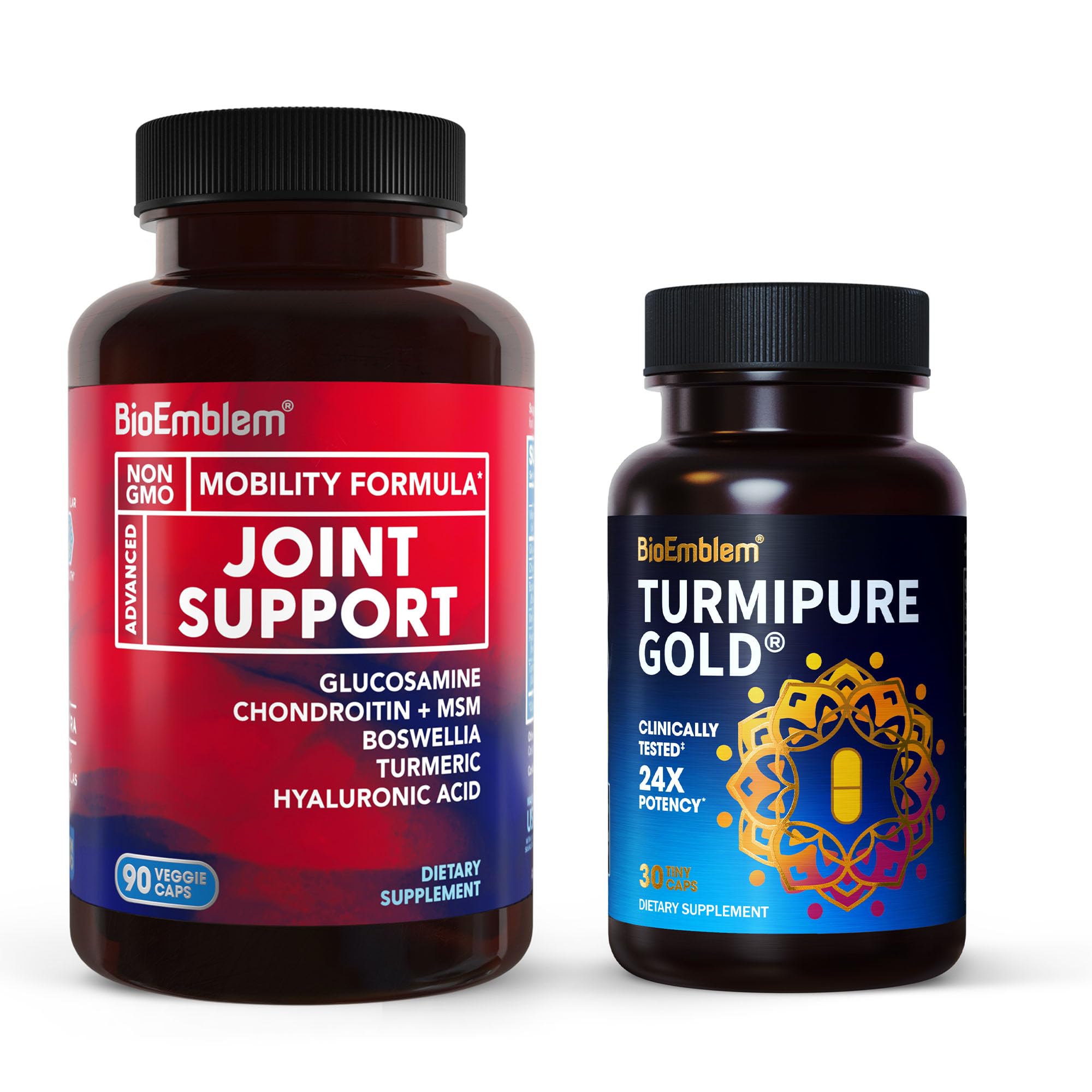 Nourish Joints From Inside Out: BioEmblem's Joint Support Mobility Formula is formulated with 1500 MG Glucosamine and 525 MG Chondroitin + MSM for enhanced joint health by helping the body maintain healthy cartilage. Support comfort in your back, knees, and hands.*. Scientifically Proven - Superior Bioavailability: Most turmeric curcumin formulas use large volume doses to make up for the fact that very little curcumin in them is actually absorbed into the blood. The curcumin in TurmiPure Gold extract on the other hand is much more highly absorbed. Human clinical trials have shown that just a small 300mg of TurmiPure Gold delivered more measurable curcuminoids into the bloodstream in 24 hours than other popular turmeric extract formulas in larger doses.*. TurmiPure Gold - Clinically Studied For 24x Better Absorption: When it comes to turmeric's benefits, curcuminoid absorption is what matters the most. TurmiPure Gold is a patented turmeric extract made through a unique microemulsion process. This extract is clinically proven by studies to be 24x more bioavailable than standard turmeric curcumin extract with black pepper. Just 1 small capsule a day replaces 4 large standard turmeric supplement capsules.*.