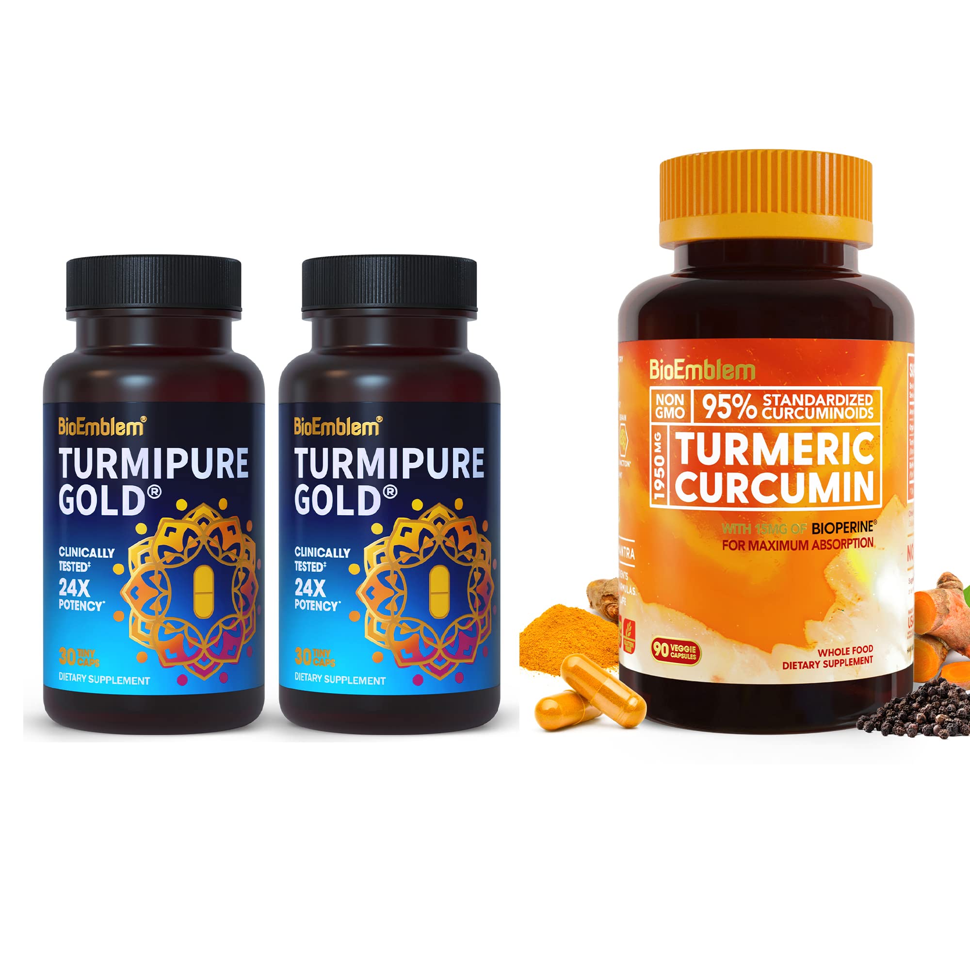 Antioxidant Powerhouse & No Black Pepper: TurmiPure Gold contains powerful antioxidants that support the immune system, promote cognitive function and memory, support heart health, and promote healthy blood circulation – it provides whole-body health benefits. Because of its superior absorption, TurmiPure Gold extract doesn't need the black pepper or BioPerine that other turmeric capsules and curcumin supplements add.*. Scientifically Proven - Superior Bioavailability: Most turmeric curcumin formulas use large volume doses to make up for the fact that very little curcumin in them is actually absorbed into the blood. The curcumin in TurmiPure Gold extract on the other hand is much more highly absorbed. Human clinical trials have shown that just a small 300mg of TurmiPure Gold delivered more measurable curcuminoids into the bloodstream in 24 hours than other popular turmeric extract formulas in larger doses.*. urmiPure Gold - Clinically Studied For 24x Better Absorption: When it comes to turmeric's benefits, curcuminoid absorption is what matters the most. TurmiPure Gold is a patented turmeric extract made through a unique microemulsion process. This extract is clinically proven by studies to be 24x more bioavailable than standard turmeric curcumin extract with black pepper. Just 1 small capsule a day replaces 4 large standard turmeric supplement capsules.*. ANTIOXIDANT SUPPORT, HEALTHY AGING AND IMMUNITY: Curcuminoids have powerful antioxidant properties that support healthy cells and skin. In addition, Curcumin's molecular structure supports the body's natural immune system and healthy brain function.*. PURE INGREDIENTS, POTENT FORMULA: BioEmblem's formula is made with organic turmeric root powder, uses only non-GMO ingredients, and is derived from natural and whole food sources. This formula incorporates an extra strength extract standardized to 95% curcuminoids and BioPerine to maximize absorption into the bloodstream by up 20x. Each capsule is vegan friendly and gluten free as well.*.