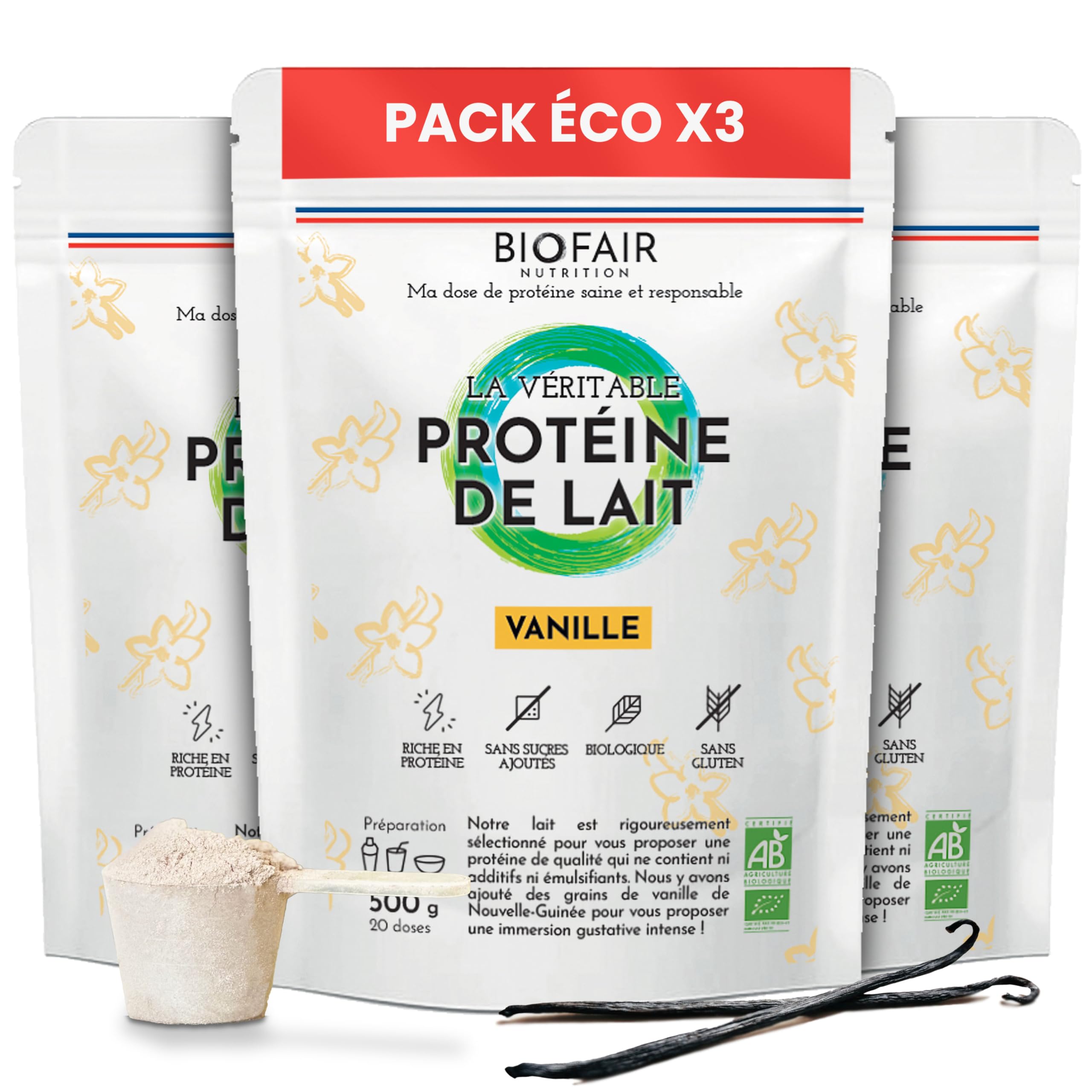BIOFAIR NUTRITION - Whey Protein Vanilla Bio – 3 pieces – healthy, 100 natural and from our French pastures – vanilla flavor – 1500 g INGREDIENTS 98.75 small milk protein , 1.25 Madagascar vanilla powder . Products from organic farming. (Allergens: Contains lactose).BIOFAIR, THE CHANGED BRAND YOU WANT WELL: Choosing Biofair Nutrition means encouraging small French producers, the short circuit and the economy of our regions, that is supporting local production, sustainable and environmentally friendly. Join our consumer community now. SHAKER, SMOOTHIE, PANCAKE, DIFFERENCE FUN: Easy to digest, Whey Biofair Nutrition fits into any diet. This vanilla version is ideal for smoothies, pancakes and other sweet treats. Use it daily or occasionally to boost your energy!. HEALTHY, RESPONSIBLE AND OVERVITAMINATED NORMAND Protein: 100 natural, organic and made in Normandy, our whey is obtained by double filtration and drying at low temperature to preserve all its nutritional value. Free from soy lecithin, additives, emulsifiers, animal pressure and gluten-free. Purer and more French, it doesn't exist! For athletes, but not that: vegetarian, flexitarian, diet or just concerned about your diet? Fill your protein gaps. Low in calories and with a strong satiety power, you limit the craving for nibbling and take care of your health. IDEAL FOR DEVELOPING AND MAINTAINING YOUR MUSCLES: Rich in essential amino acids and very popular among athletes, our whey protein concentrate of 76 g per 100 g boosts your performance by contributing to the development of muscle tissue. You will love the vanilla flavor with our real organic vanilla powder from Madagascar. Give your recovery a boost and intensify your sports sessions!.Whey Proteïne Vanille Bio – 3 stuks – gezond, 100 natuurlijk en uit onze Franse weiden – vanillesmaak – 1500 g BIOFAIR NUTRITION - Whey Proteïne Vanille Bio – 3 stuks – gezond, 100 natuurlijk en uit onze Franse weiden – vanillesmaak – 1500 g INGREDIËNTEN 98,75 kleine melkeiwit , 1,25 Madagaskar vanillepoeder . Producten van biologische landbouw. (Allergenen: Bevat lactose).BIOFAIR, HET GEWIJZIGDE MERK DAT JE GOED WIL: Kiezen voor Biofair Nutrition betekent het aanmoedigen van kleine Franse producenten, het korte circuit en de economie van onze regio's, dat is het ondersteunen van lokale productie, duurzaam en milieuvriendelijk. Word nu lid van onze consumentengemeenschap. SHAKER, SMOOTHIE, PANCAKE, VERSCHIL PLEZIERS: Gemakkelijk te verteren, Whey Biofair Nutrition past in elk dieet. Deze vanilleversie is ideaal voor smoothies, pannenkoeken en andere zoete lekkernijen. Gebruik het dagelijks of af en toe om je energie te stimuleren!. GEZOND, VERANTWOORDELIJK EN OVERVITAMINEERD NORMAND Proteïne: 100 natuurlijk, biologisch en gemaakt in Normandië, onze wei wordt verkregen door dubbele filtratie en drogen op lage temperatuur om al zijn voedingswaarde te behouden. Vrij van sojalecithine, additieven, emulgatoren, dierlijke druk en glutenvrij. Zuiverder en Frans, het bestaat niet!. Voor sporters, maar niet dat: vegetarisch, flexitarisch, dieet of gewoon bezorgd over je dieet? Vul je eiwittekorten op. Laag in calorieën en met een sterke verzadigingskracht, beperk je het verlangen naar knabbelen en zorg je voor je gezondheid. IDEAAL VOOR HET ONTWIKKELEN EN ONDERHOUDEN VAN JE SPIEREN: Rijk aan essentiële aminozuren en zeer populair bij sporters, ons wei-eiwit concentraat van 76 g per 100 g stimuleert je prestaties door bij te dragen aan de ontwikkeling van spierweefsel. Je zult genieten van de vanillesmaak met ons echte biologische vanillepoeder uit Madagaskar. Geef je herstel een boost en voer je sportsessies aan!.