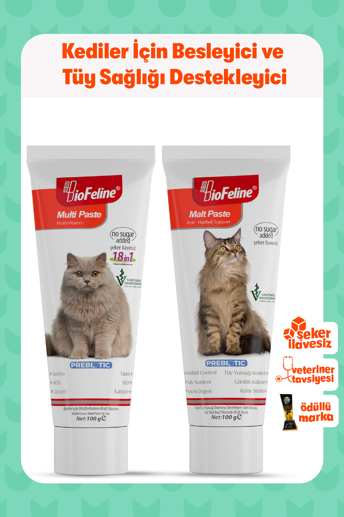 Biofeline Multi Paste is a complementary food containing vitamins and amino acids that support the healthy development of cats and increase their body resistance. It is a vitamin and mineral supplement containing 18 important vitamins that strengthen immunity, accelerate metabolic development, support skin and coat health, and provide energy and vitality. It also contains taurine, which supports heart and eye health, and prebiotic mannan oligosaccharide (m.O.S.), which supports the digestive system. It does not contain sugar.