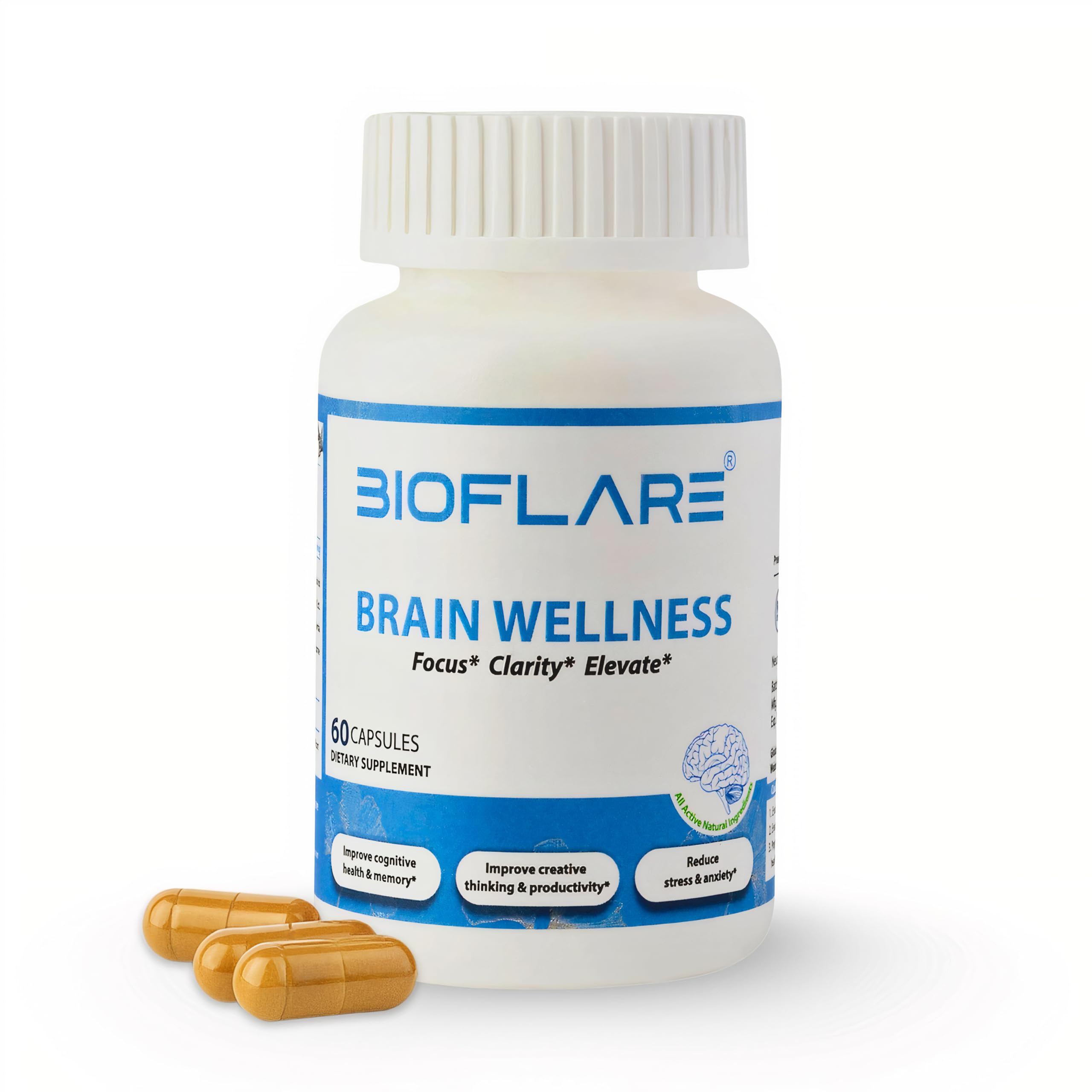 Backed by Real Results and Raving Reviews: Join thousands who have improved focus, memory, and creativity with BIOFLARE. Whether you're seeking memory supplements for seniors, memory vitamins brain for women, or the best brain supplements for memory and focus, this brain and focus supplement for brain delivers results you can feel. Trusted by many, it's a brain health supplement for adults that earns its reputation with every capsule. Gentle and Naturally Balanced: Formulated with natural adaptogens and botanicals, this memory enhancer supplement for adults works in harmony with your body to help reduce stress and mental fatigue, without jitters, crashes, or stomach discomfort. Ideal for sensitive individuals looking for a memory supplement for brain health, it offers the benefits of brain booster support without the harsh side effects often found in other focus supplements for adults. Clean, Tested, and Trusted Quality: Produced in GMP-certified facilities, BIOFLARE is a brain health supplement for adults that's third-party tested for purity and potency. Every capsule contains clean, plant-based ingredients with no hidden fillers, making it a reliable brain booster supplement you can trust. Designed for transparency and quality, it stands out among brain supplements and memory vitamins for its safety and effectiveness. Effective Dosage Backed by Science: Unlike many brain and memory pills that under-deliver, BIOFLARE offers optimized, research-backed dosages to support lasting results. This focus factor brain supplement is formulated for professionals, creatives, and students who need consistent mental performance. A true brain defender supplement, it combines targeted nutrients and adaptogens to help keep you sharp, making it one of the best focus supplements for adults who want the best vitamins for memory and focus. Premium Ingredients for Peak Brain Health: BIOFLARE Brain Wellness Capsules combine proven nootropics like Bacopa Monnieri, Ginkgo Biloba, and Ashwagandha, powerful ingredients found in some of the best brain supplements for memory and focus. This nootropic supplement also includes essential memory vitamins brain for women and men, making it an advanced nootropics brain support supplement for adults seeking clarity, creativity, and mental performance. Ideal as a memory supplement for brain function, it's your natural brain booster for everyday success.