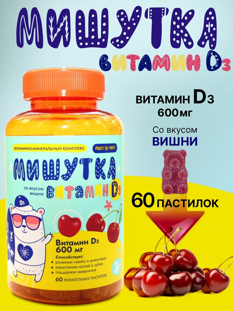 Мишутка витамин D3 – это вкусные жевательные витамины, специально разработанные для детей. В каждой упаковке содержится 60 жевательных пастилок, что обеспечит ваш ребенок необходимым количеством витамина D3 на протяжении длительного времени. Мишутка витамин D3 – это не просто полезный, но и вкусный способ позаботиться о здоровье своего ребенка. Форма мишек делает прием витаминов увлекательным процессом, а приятный вкус понравится даже самым привередливым детям. Витамин D3 играет важную роль в росте и развитии костей, укреплении иммунитета и поддержании общего здоровья. Мишутка витамин D3 – это надежный помощник для родителей, которые заботятся о здоровье своих детей. Регулярный прием этих витаминов поможет вашему ребенку расти здоровым и сильным. Мишутка витамин D3 – это вкусный и полезный способ обеспечить организм ребенка необходимым количеством витамина D3. Рекомендации по применению: детям старше 3 лет и взрослым по 1 пастилке в день, разжевывая после еды. Продолжительность приема: 1 месяц. При необходимости прием можно повторить.