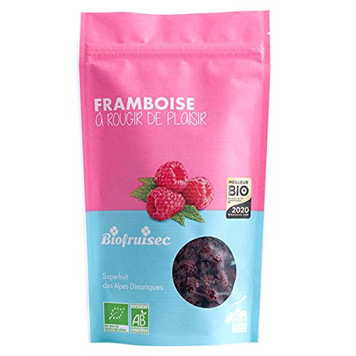 Dried raspberries from the Dinaric Alps. A natural source of antioxidants. Voted Best Organic Product 2020. Vegan-friendly. Enjoy on their own or incorporate into your culinary creations. 100g eco-friendly resealable bag. See full descriptionDried European Raspberries 100g. Biofruisec. Organic dried red fruits. Organic dried fruits. Dried fruits. Framboises séchées des Alpes Dinariques. Source naturelle d'antioxydants. Elues Meilleur Produit Bio 2020. Compatibles régime Vegan?. A déguster nature ou à incorporer dans vos préparations culinaires. Sachet refermable éco-conçu de 100g. Voir le descriptif completFramboises d'Europe séchées 100g. Biofruisec. Fruits rouge séchés bio. Fruits séchés bio. Fruits secs.