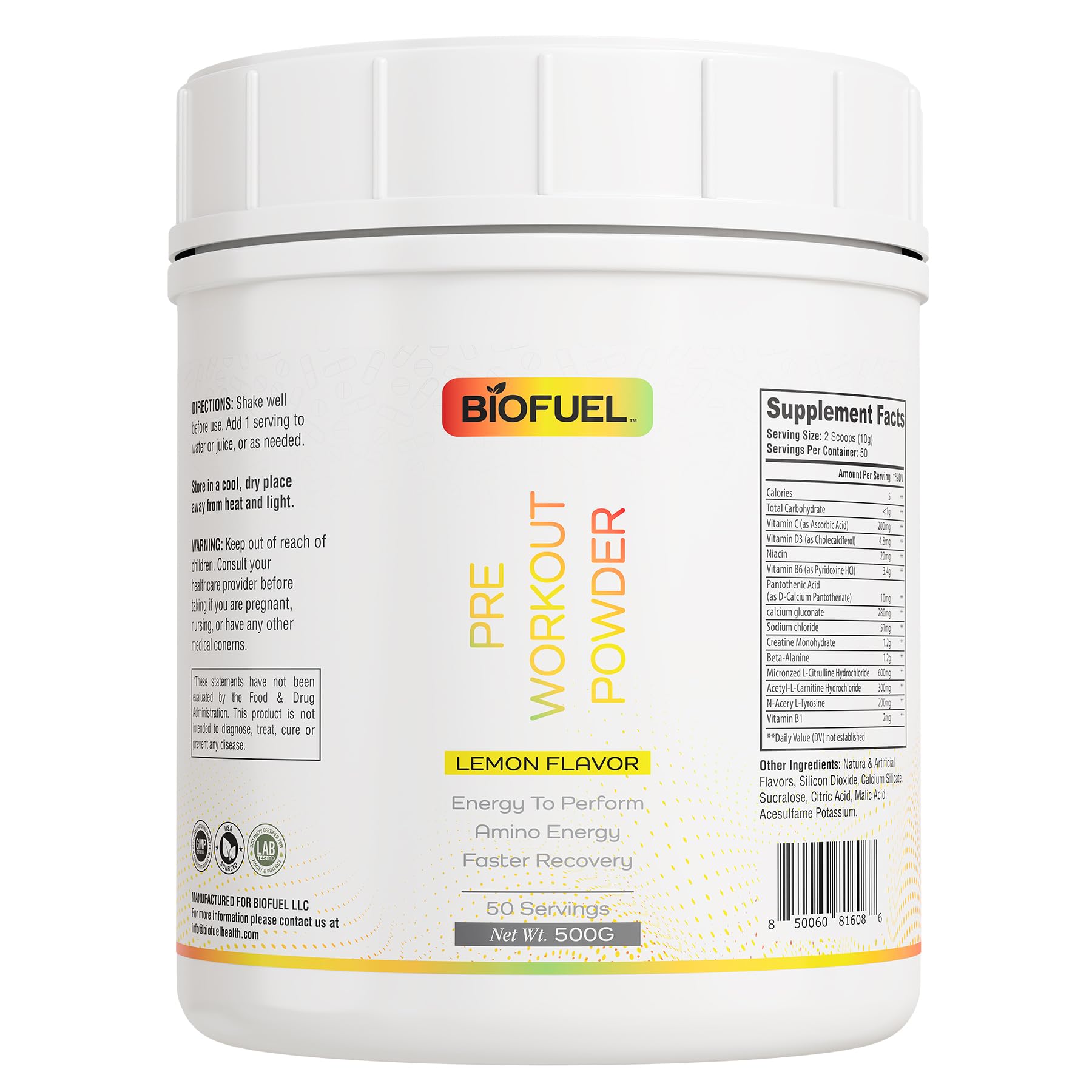 BIOFUEL PRE-WORKOUT POWDER – ELEVATE YOUR WORKOUT ROUTINE Experience the superior quality and comprehensive benefits of Biofuel Pre-Workout Powder. Our dedication to innovation and quality is evident in every aspect of our product, from carefully sourced ingredients to our premium packaging. WHY CHOOSE BIOFUEL PRE-WORKOUT POWDER? ENHANCES AMINO ENERGY: Formulated to provide a significant boost in amino energy, helping you power through intense workouts. IMPROVES WORKOUT PERFORMANCE: Designed to enhance your workout performance, allowing you to train harder and achieve your fitness goals. PROMOTES FASTER RECOVERY: Supports faster recovery times, helping your muscles recover more efficiently post-exercise. PREMIUM INGREDIENTS: Sourced from trusted suppliers, our ingredients are known for their purity and effectiveness, ensuring maximum benefits with every serving. NATURAL LEMON FLAVOR: Infused with a refreshing natural lemon flavor, making it enjoyable to consume before your workouts. CONVENIENT DOSAGE: With 50 servings per container and a recommended serving size of 2 scoops (10g), Biofuel Pre-Workout Powder offers a simple and effective way to boost your workout. HOW TO USE: Mix 2 scoops (10g) with water or your favorite beverage 30 minutes before your workout. Store in a cool, dry place. These statements have not been evaluated by the Food and Drug Administration. This product is not intended to diagnose, treat, cure, or prevent any disease.