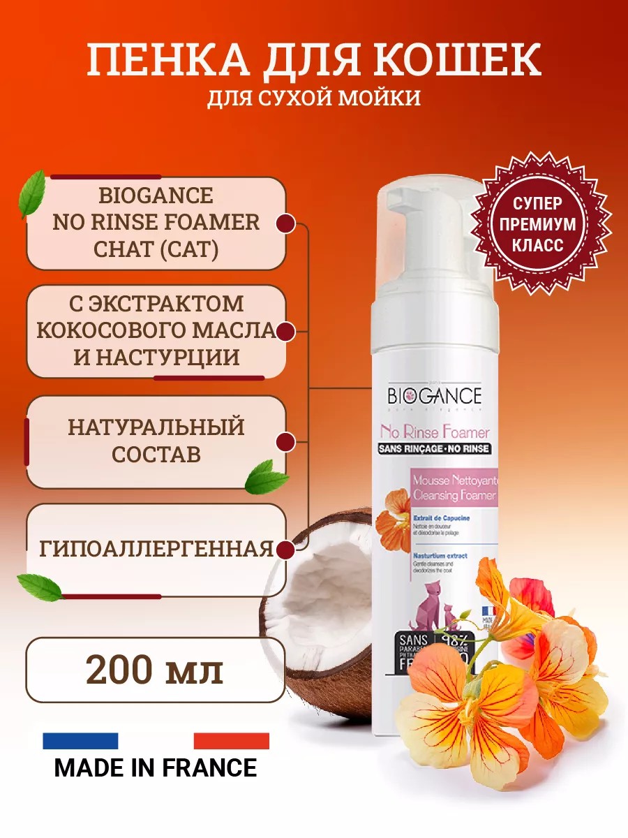 Этот инновационный продукт, созданный специально для кошек, подарит Вашему питомцу эффект чистой шерсти всего за 1 минуту. Это идеальное решение для тех, кто ищет простой и эффективный способ для подержания блеска и чистоты шерсти питомца. Пенка для животных Biogance NO-Rinse Foamer обогащена экстрактами кокосового масла, настурции и глицерина, создавая мягкую и эффективную формулу. Этот шампунь-лосьон не только прекрасно очищает шерсть, но и уменьшает раздражение кожи, уничтожает неприятные запахи и обладает антистатическим действием. Помимо своих потрясающих очищающих свойств, Biogance NO-Rinse Foamer идеально подходит для кошек всех видов шерсти, однако его рекомендуется с аккуратностью использовать как шампунь для кошек длинношерстных, так как он может вызвать запутывание. В остальном, эта пенка для сухой мойки безопасна и подходит как шампунь для кошек и котят.