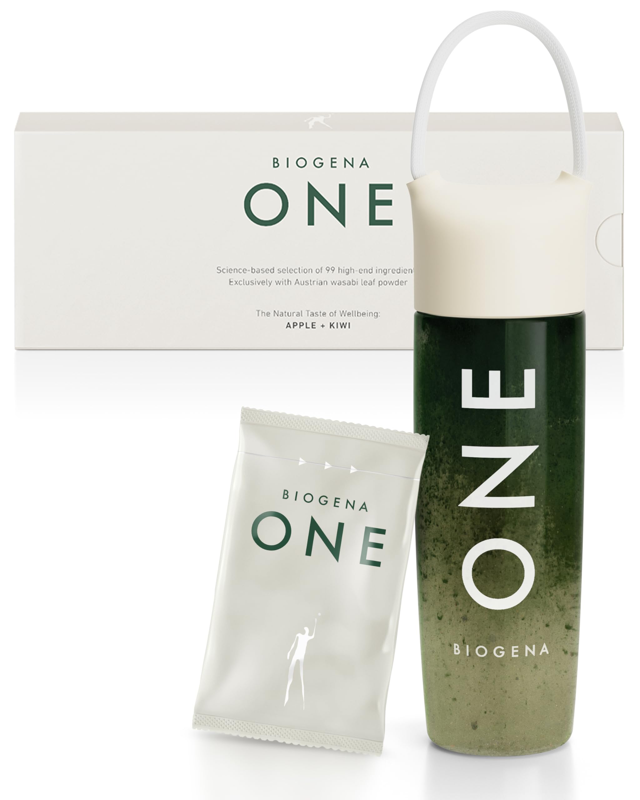 Discover the super greens powder designed to support your wellness goals. BIOGENA ONE is more than just another greens powder superfood—it's a comprehensive nutrition powder for women and men featuring 99 premium ingredients including all 13 essential vitamins, 11 minerals, 10 probiotic strains (5 billion CFU) to support gut health, bioavailable CoQ10 (KANEKA Ubiquinol), amino acids, medicinal mushrooms, and 49 select botanicals like ginseng and resveratrol. In our clinical study, 86 of participants experienced more energy, 77 noticed improved digestion, and 63 reported better sleep quality after 4 weeks. This prebiotic drink mix with enzymes, probiotics and prebiotics is formulated to support digestive health, immune function, energy metabolism, and mental clarity. Unlike other superfood green powder products with hidden proprietary blends, we fully disclose every ingredient and exact dosage. Made in our ISO 22000 and GMP-certified facility in Salzburg, Austria, following our Pure Substance Principle with zero sugar, gluten, dairy, artificial colors, or pesticides. The refreshing apple-kiwi flavor won our blind taste tests, making it a healthy morning drink you'll look forward to—smooth, naturally fruity, never grassy or chalky like typical greens powder packets. Your Starter Bundle includes 30 travel-friendly sachets (perfect as a morning restore powder or boost greens anytime), plus a premium 13.5 fl oz reusable shaker bottle. Ready in just 30 seconds: pour cold water, shake, and enjoy complete nutrition to support your daily wellness. Whether you're looking for a premium greens powder, womens healthy supplements, or nutritional support for your busy lifestyle, BIOGENA ONE combines European manufacturing standards with complete ingredient transparency. These statements have not been evaluated by the Food and Drug Administration. This product is not intended to diagnose, treat, cure, or prevent any diseaseREADY IN JUST 30 SECONDS: Includes 30 pre-measured sachets plus a 13.5 fl oz reusable bottle. Simply mix one sachet with 8.5-10 fl oz of water, shake, and sip. Designed to support your daily nutrition—your simple ritual for everyday well-being. APPLE-KIWI FLAVOR YOU'LL LOOK FORWARD TO: Smooth, naturally fruity, never too sweet. In blind taste tests, BIOGENA ONE was rated the most enjoyable greens drink. A refreshing flavor refined over months by our scientists and nutritionists. PREMIUM INGREDIENTS EUROPEAN QUALITY: Produced in our own facility in Austria under ISO 22000 and GMP standards, following our Pure Substance Principle. That means no unnecessary additives such as artifical colors. 99 SMART NUTRIENTS IN ONE DRINK: 13 vitamins, 11 minerals, 10 premium probiotic strains (5 billion CFU), bioidentical CoQ10 (KANEKA), amino acids, and botanicals. Developed to support energy metabolism, immune function and mental clarity. . SHOWN IN OUR CLINICAL STUDY – RESULTS IN JUST 4 WEEKS: 86 of participants experienced more energy, 77 noticed better digestion, 63 slept more soundly, and 64 felt less stressed. Real wellness that's measurable—and truly felt.